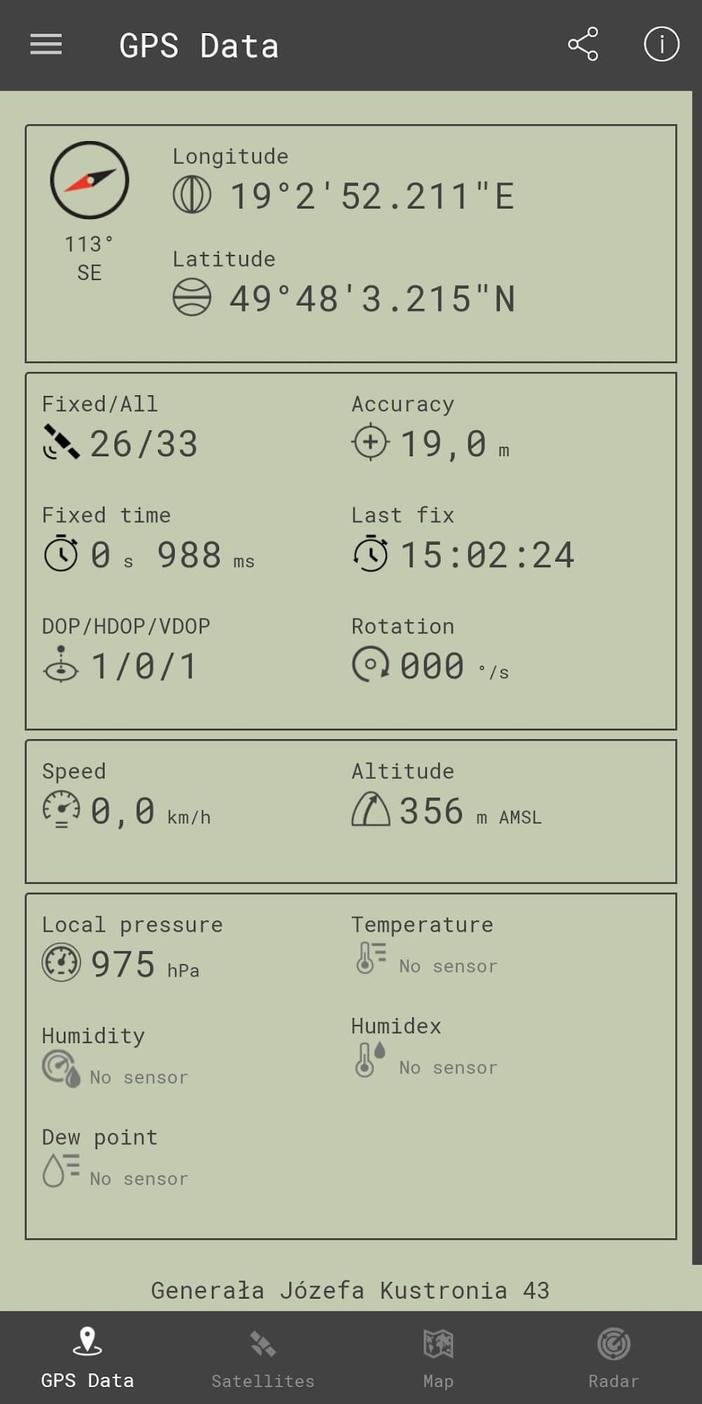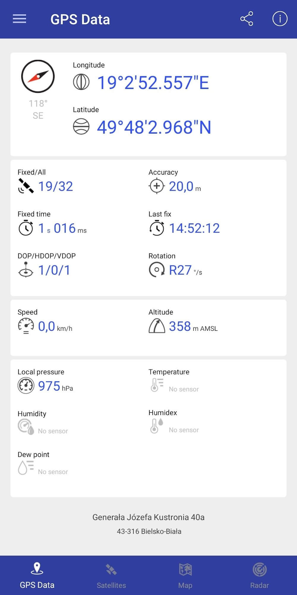 And so many better features are that are available in this app. This app is perfect for everyone. Why? Because there was an option that you would write the data for the current location into a CSC file, there is another option in the menu to share, download, or clear that accumulated data file. And could easily use this app for mass geotagging purposes. Compared to the old app, this app has some advanced new features that are available in this app, which is improved pressure accuracy INHg, psi, and units. Sharing and copying the location by coordinates or Google Map link is easy. Minor bugs fixed, and stability improvement. And mew exciting color styles like Military and Blue. Added Portuguese and Danish translations in this app. And radar can enter values in degrees like Decimal Degrees or Degrees, Minutes, and Seconds.