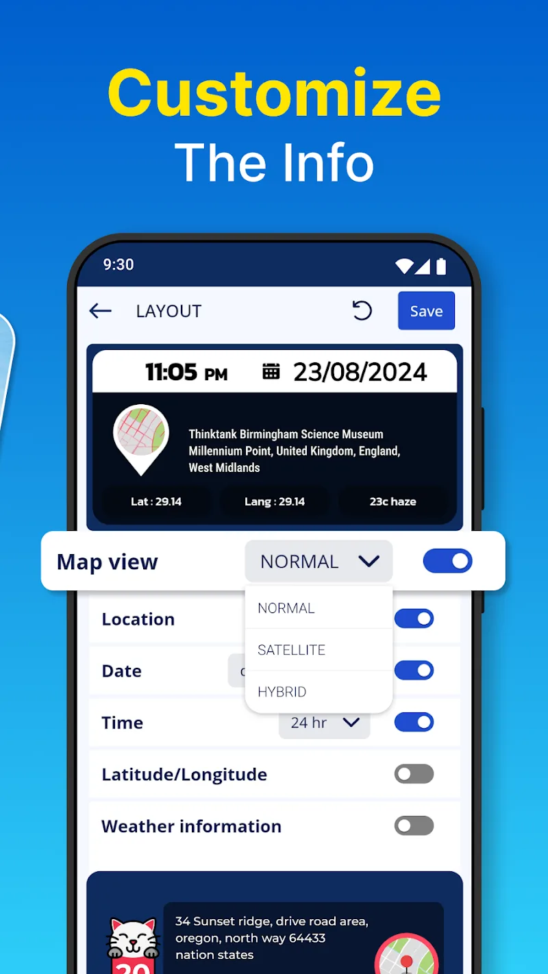 • Custom Layout Views: Photos taken with the GPS camera will display all information related to the location and time of shooting. The application allows users to preview the layout of the photo. Before the photos are saved, the application allows them to edit the location of the location information display.