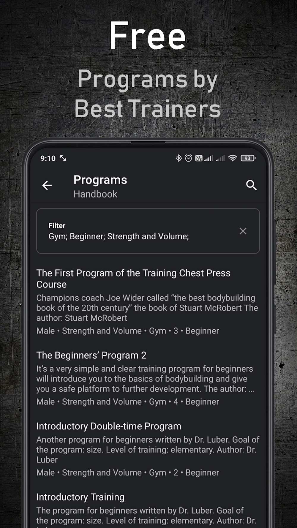 Top fitness trainers have carefully selected about 60 separate courses. Using filters, you can quickly choose a plan for any goal, including weight loss, weight gain, and endurance. When filtering, you can also choose your gender, location, frequency, and training intensity. After choosing the right workout plan, you can tailor it to your preferences.