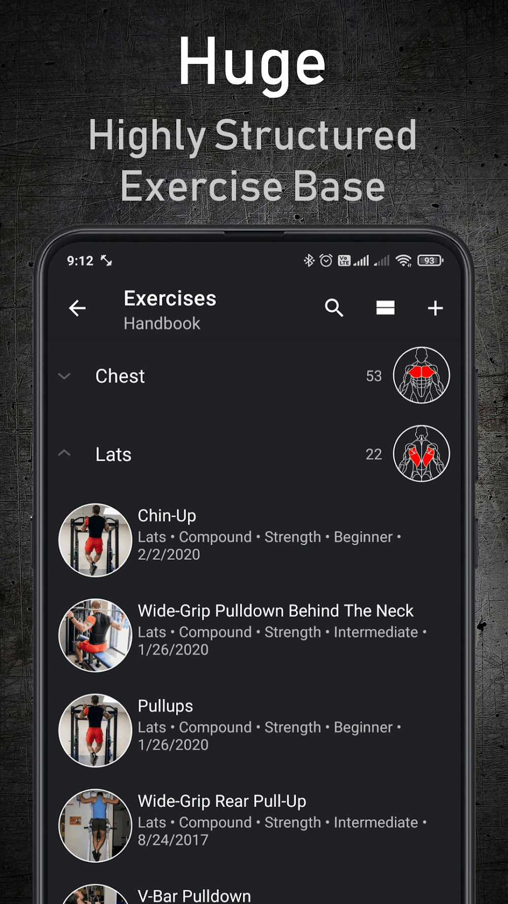 There are more than 500 training exercises available. Pictures and detailed descriptions for both men and women accompany each exercise. You can quickly find a suitable exercise using the filters or searching by name. You can filter by muscle group, training style, equipment, effort type, and ability level.
