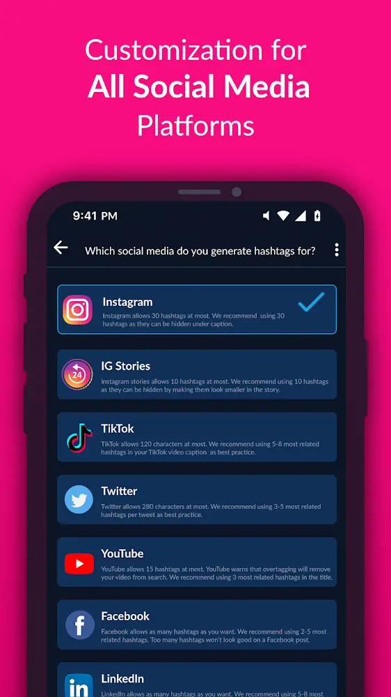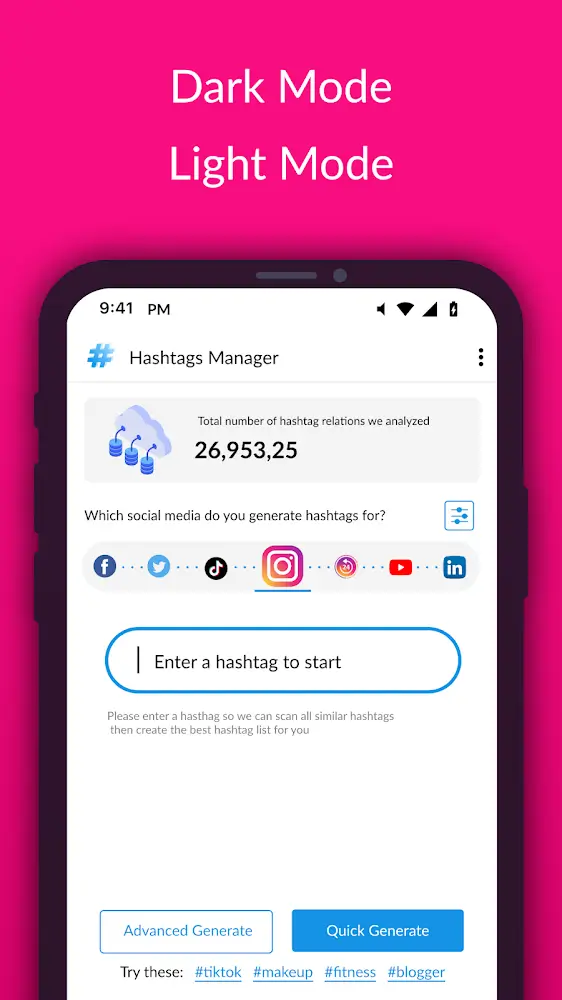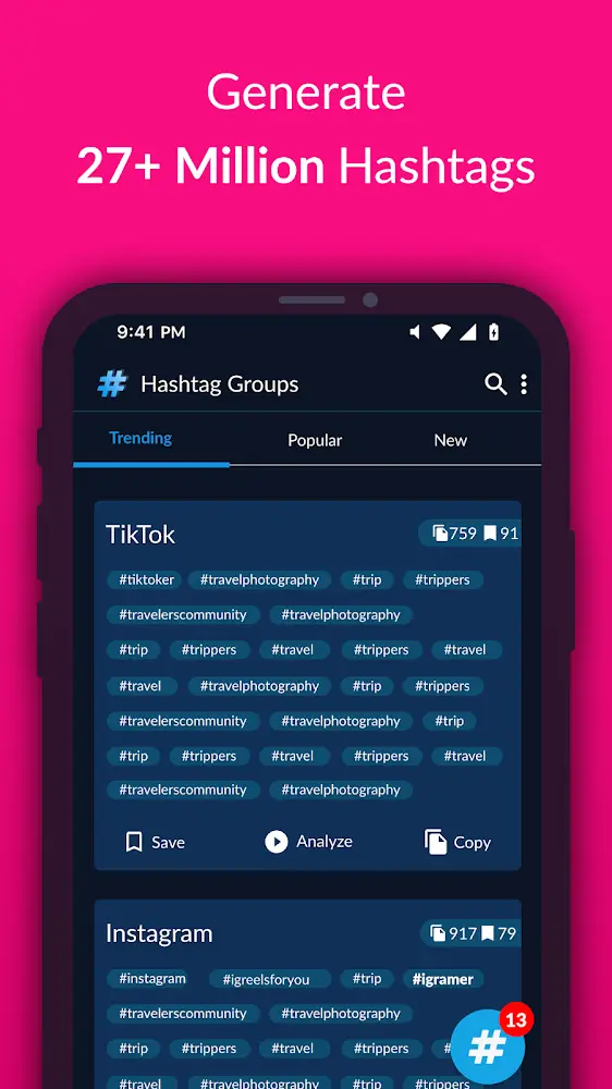 A variety of social networking platforms will be connected to Hashtags Manager to make the process of suggesting and using your pound sign simpler. With the most popular source of connections on Instagram and TikTok, users who own accounts on these two social networks have the most opportunities to become famous. Besides, about 7 other platforms are also supported to fill quickly in the pound sign requested by the user. Your journey to make a personal mark, follow social trends, and improve your popularity will be with us. Users are ready to get more likes and followers after posts that use the suggested pound signs.