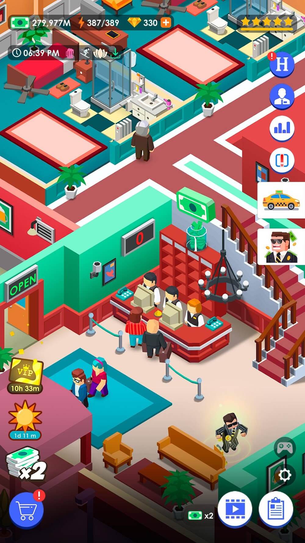 Hotel Empire Tycoon Mod APK brings you many valuable experiences and lessons in the hotel business. Players are allowed to design and build their hotels in their style. Besides, you try to upgrade and improve them to become high-class resorts. Not only that, players need to prepare full facilities in each room of the hotel to meet the needs and desires of customers. Besides, players also add food services to the hotel.