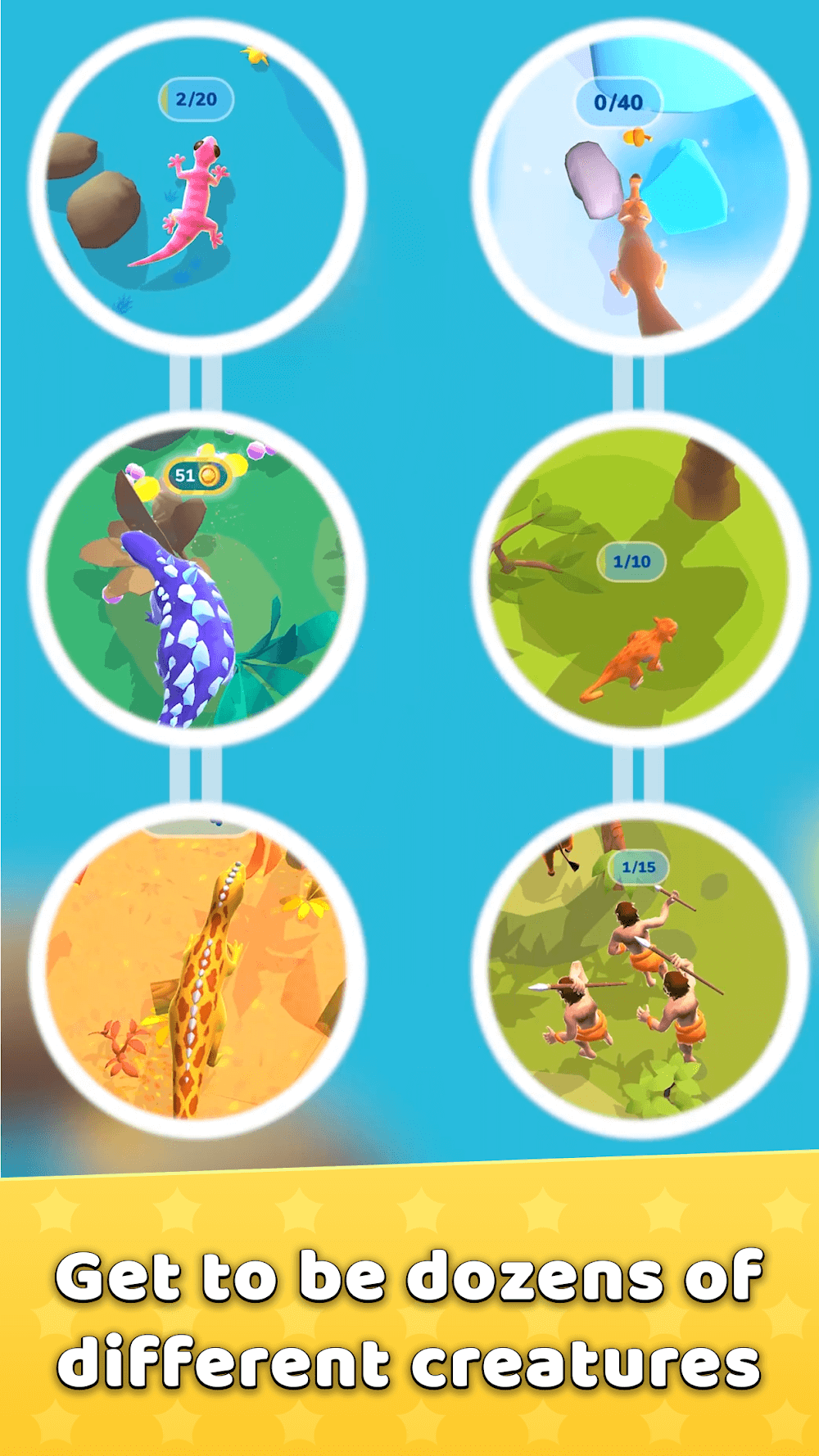 - Age progression: You will go from ancient creatures and go through difficult and challenging evolutionary missions and challenges to become a more intelligent creature, which is Humans. When you become a human, you will possess superior intelligence and start your civilization.