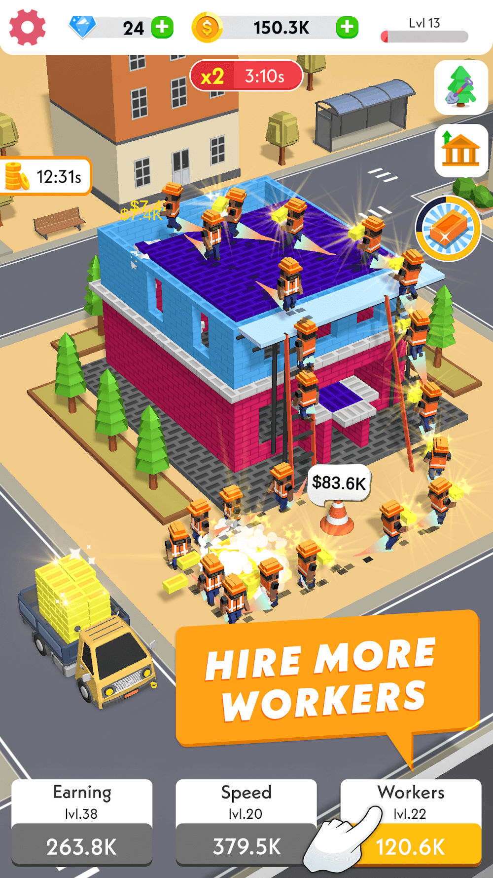- Hiring and training workers: Players can hire workers to join their construction team and train them to become more efficient at building, making more money, and building faster.