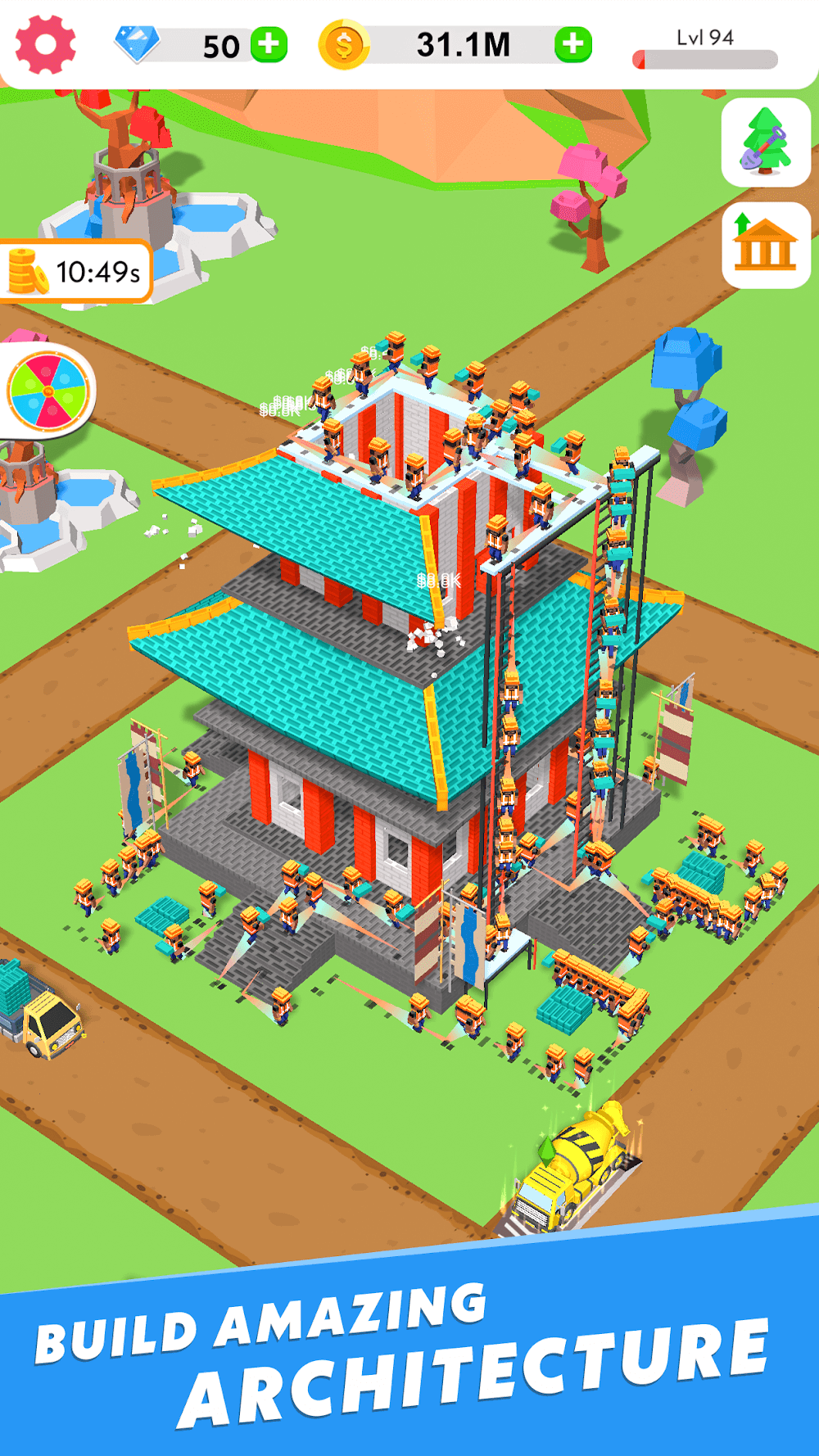 - Power-ups: Players can use power-ups to grow their business faster and stronger, such as calling a super builder to multiply construction speed or spinning a wheel to get free rewards.