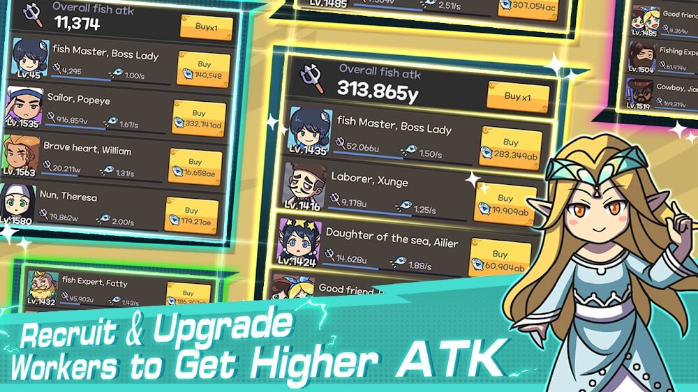 An enthusiastic team is necessary for a successful fish business. In Idle Fishing Tycoon, you can hire various fun employees as your company grows. Your team will be filled with colorful characters, each with their distinct background and set of skills, ranging from the intrepid Treasure Hunter Jones to the mystical Genie, the pious Nun Teresa, and the strong Popeye the Sailor. This charming team will not only spice up your journey, but they’ll also take excellent care of your expanding customer base.