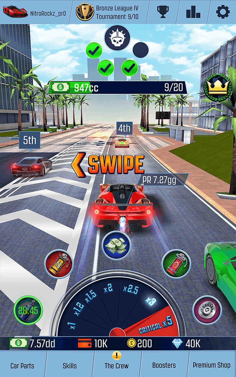 The Booster Packs contain various unique powered car parts, crew members, a bunch of cash, etc. Also, upgrade these boosters for more collections. You can equip the Steering Wheel, Engine, Wheels, Flywheel, Alternator, Rims, and Gear collected from the Bronze Pack booster to battle with the Boss car. To make more money and boosters, complete achievements like reaching 1k performance, earning 2k cash, beating 100 opponents, completing Bronze League 5, tapping 200 times, etc. And also you can assemble sets with boosters. If you want more blueprints, swipe five times. Unlock more levels and get skills like Super Fuel for high performance, Automatic Ride for auto taps, Hazardous Nitro for critical Nitro chance, etc. To experience all these fun challenges, play Idle Racing GO: Clicker Tycoon and show your racing spirit.