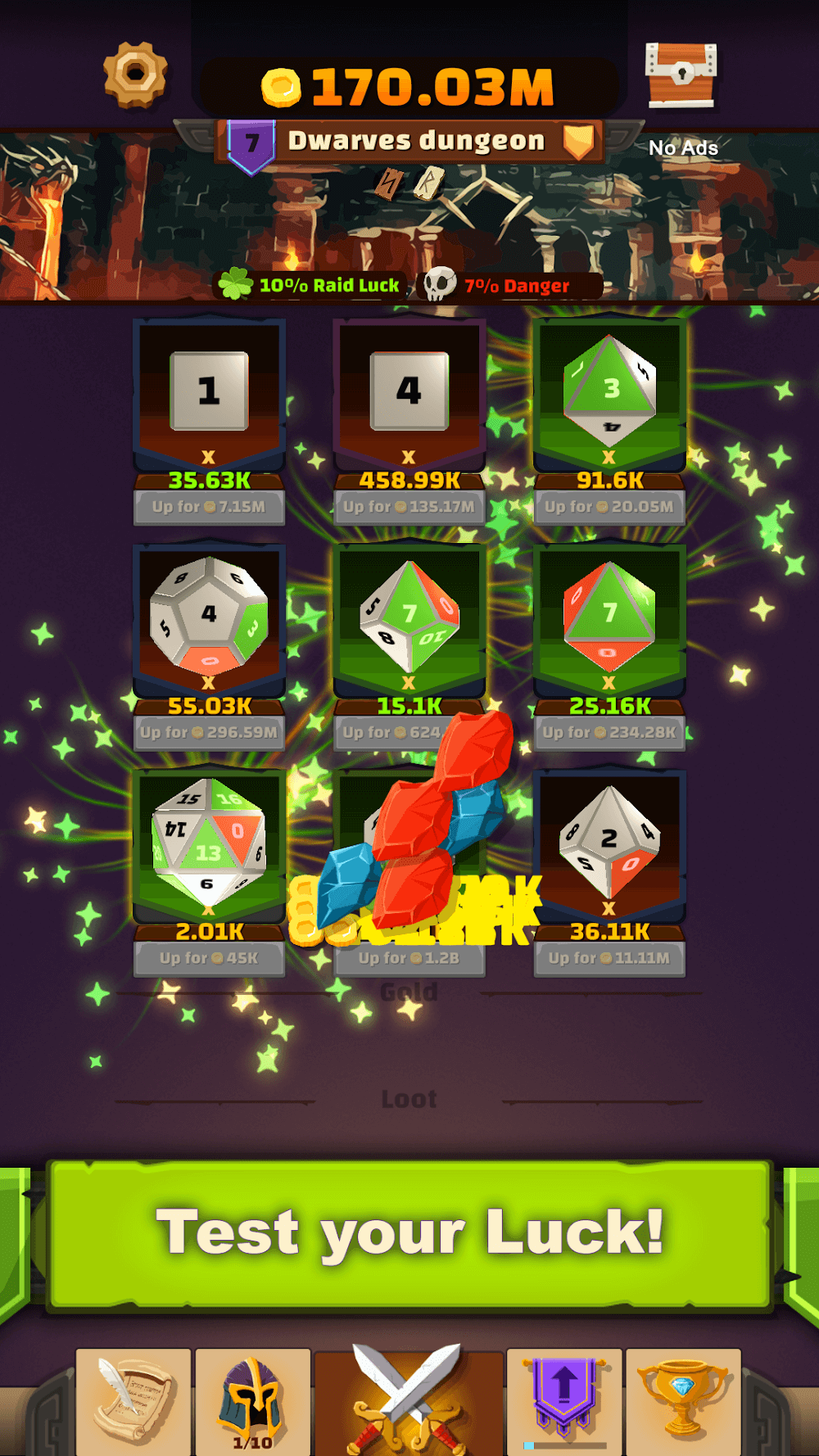 All items are given out as rewards. Idle Raids provides extremely idle quests for you. Players will roll the dice to determine their reward. Then you will find other opportunities to roll the dice again. The reward for each throw will be pre-determined to increase the fairness of this game. New characters will be unlocked for you to use in the next match. Players combine items to create a formula to upgrade the power of any character. Player decisions always affect the outcome of head-to-head matches. If you are more cautious with this lucky quest, you will get more rewards than bad luck.