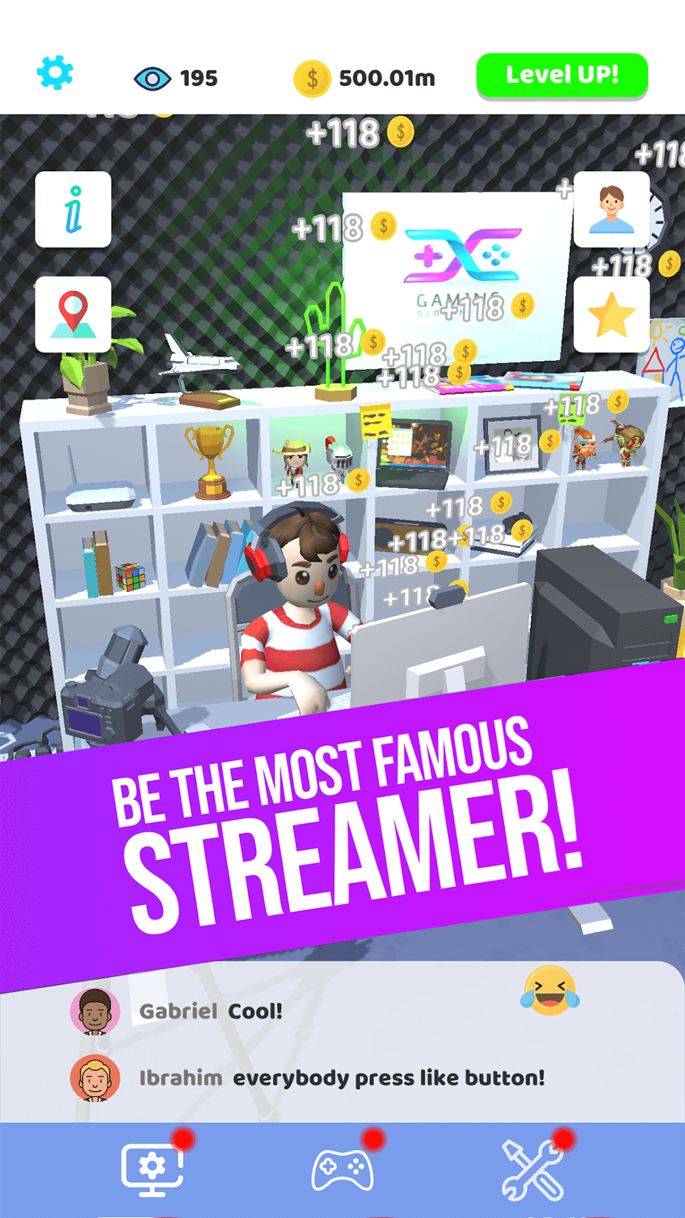 To succeed as a streamer in Idle Streamer! Then you have to invest in your stream room with some essential equipment. During live streams, it is imperative to have a computer with a quality camera and microphone so that viewers can see you clearly and hear what you say. You can also use your money to upgrade the stream room to become more spacious and decorate a few more necessary items. That will help you retain more viewers and get the most effective live streams.