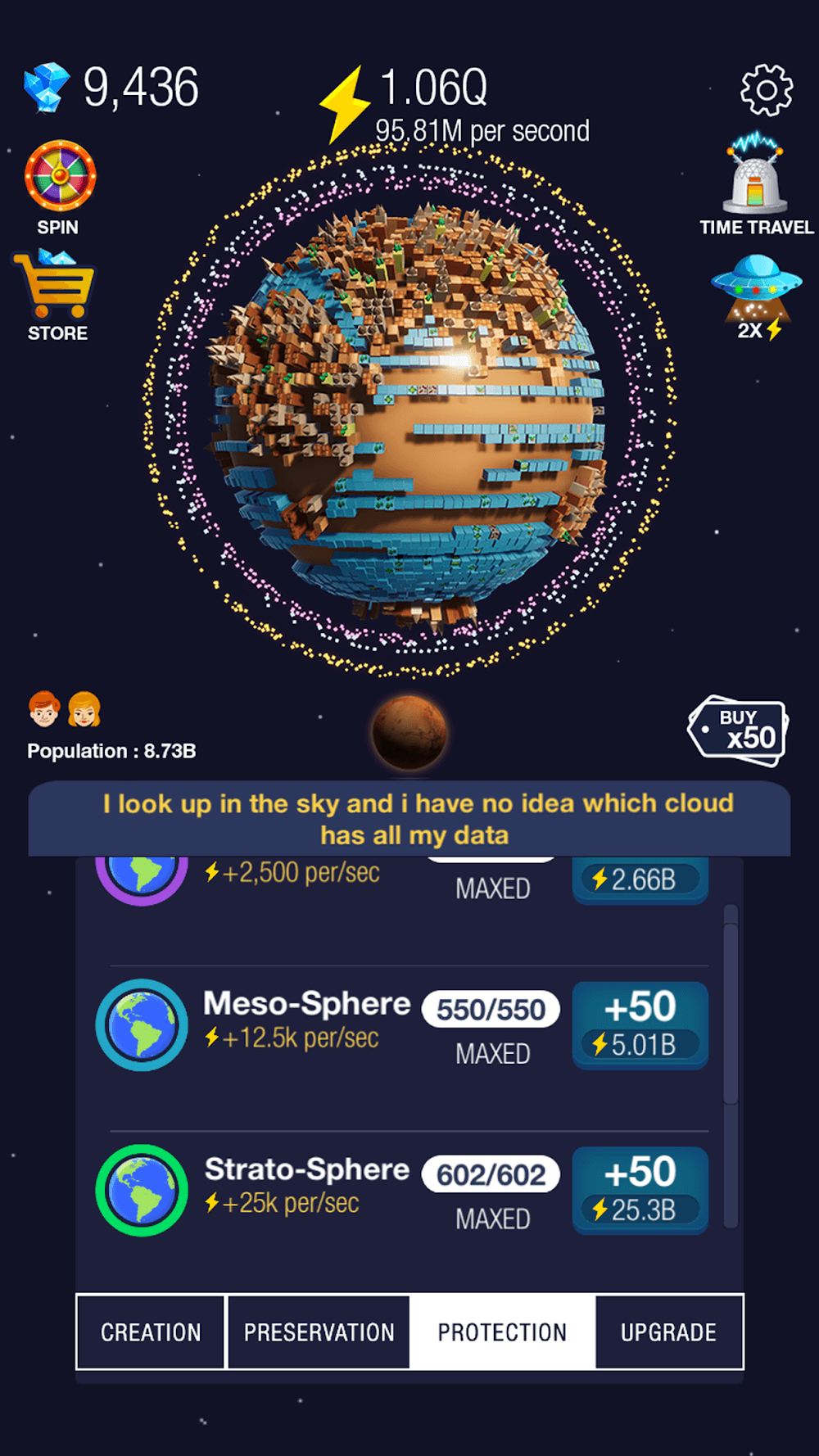 To build a globe, we must buy the items required to build it. After building it, we have to protect our globe. In this game, we saw diamonds we had collected while playing this game and charged, store to buy anything, population, settings icon, etc. To build a globe, we must first fill this with soil. In the store, we saw the land, soil, micro organism, plants, etc. This game is very amazing to play. By playing this game, students will identify anything a lot. And we can upgrade oceans,continr=ents,countries,landmarks,etc. By playing this game, children will learn a lot and enjoy it peacefully. And we can create persons also. We can plant trees, build buildings, etc. In this game, there are many general knowledge bits to learn.