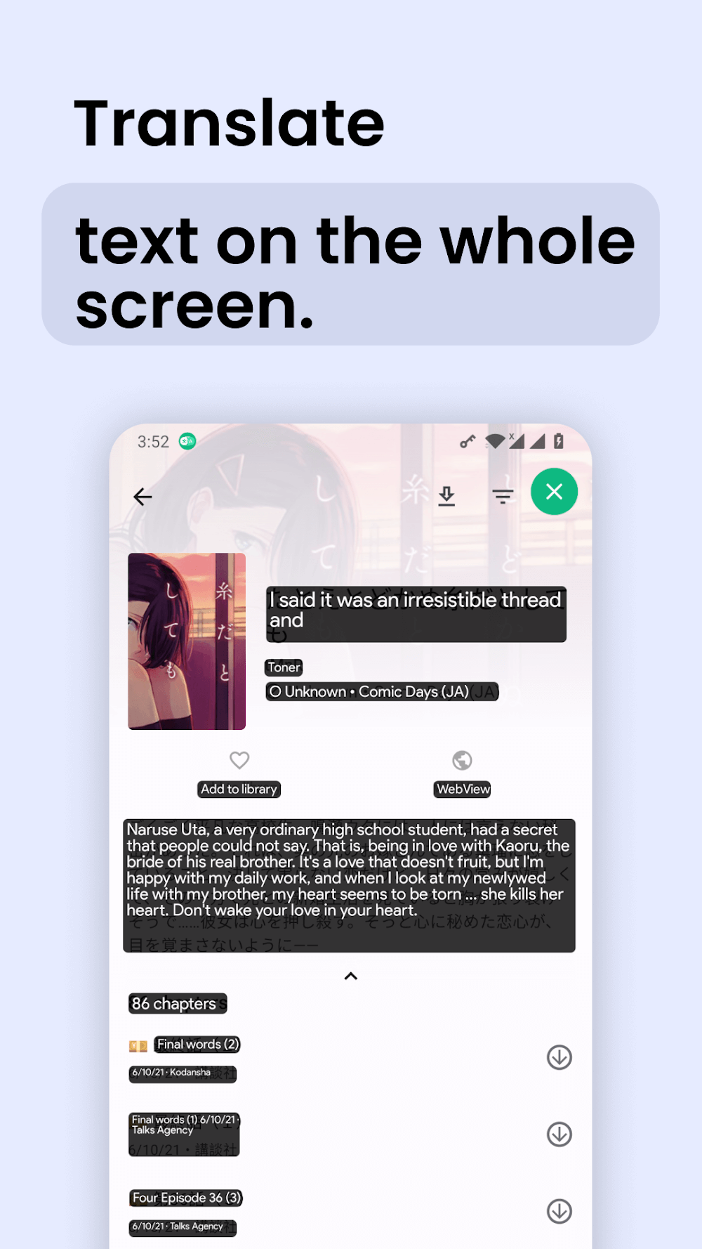 Floating mode is a feature that surely those who often surf the web using foreign languages will understand and want to use continuously. If you are reading a manga without the translated version, you should use the app’s floating feature. With just a few touches, the information on your screen becomes completely understandable, and from there, you can simply continue with the remaining pages. It only takes a little time, but it helps you understand the chapters, especially if they are climax chapters and you cannot skip any details. Gaming websites can also be handled in a completely simple way with the application.