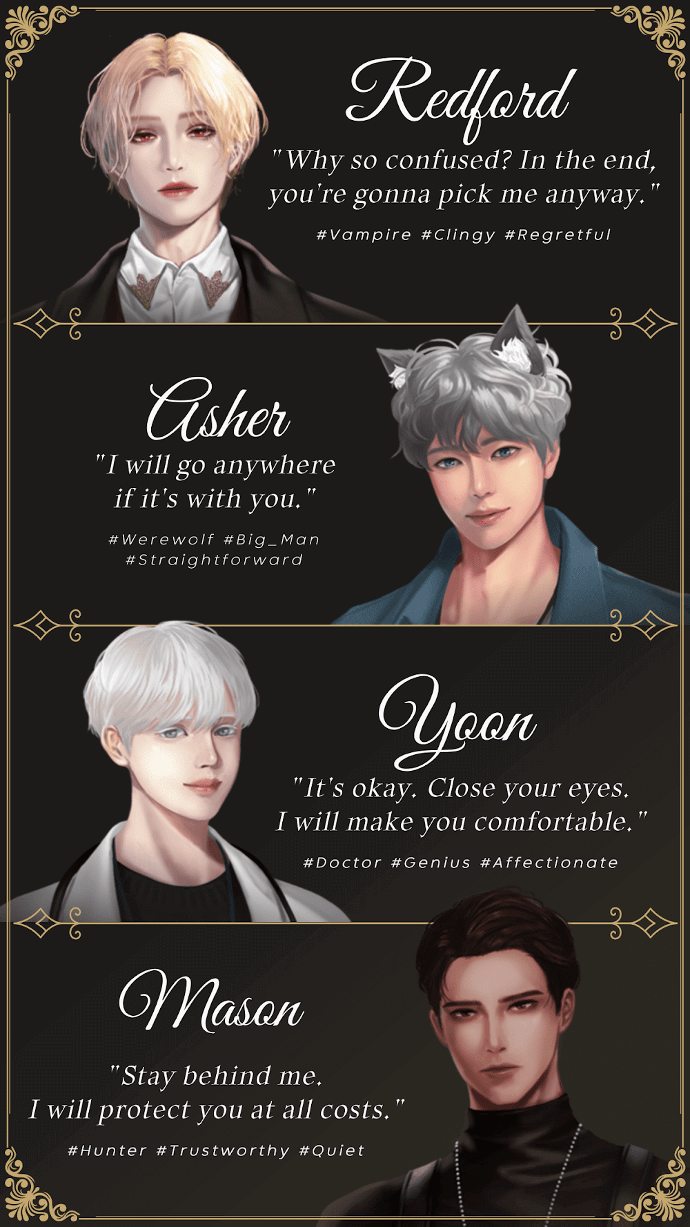 All hunter boys like you mysteriously turn into vampires. To fully understand them, someone like you will need to learn about their skills. It would be best if you chatted with each vampire child to learn about their unique qualities. Through conversations with four boys, you will gradually learn their characteristics. Likely, guys won’t trust you because they may avoid you out of fear that you might hurt them. However, if you regularly try to get close to each other, you can get away with this experience.