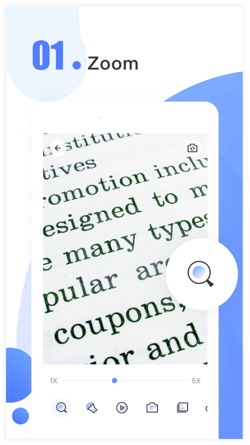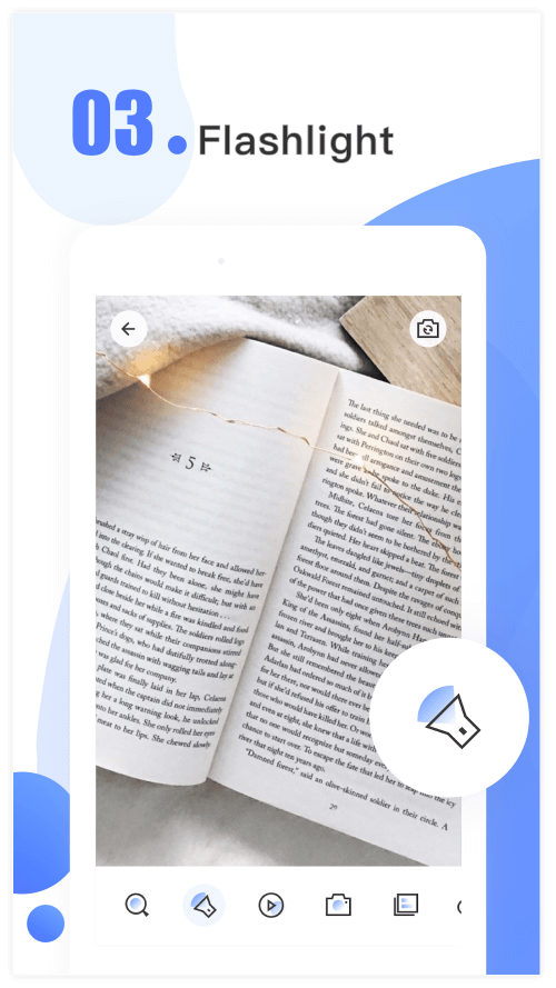The application includes a flashlight to help you view the text in low-light situations. This feature allows you to adjust the hue of the light to suit your needs, such as strong light for dimly lit areas or yellow light for reading a book. The application will allow you to shine into dark places and find objects even at night.