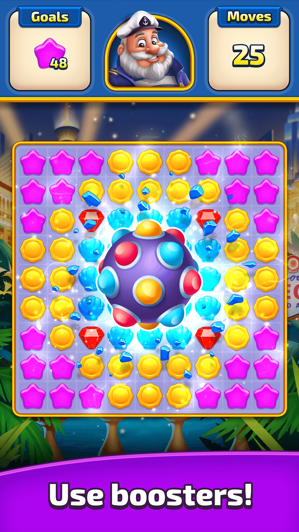 An impressive adventure in Match Cruise: Match3 Adventure will take place, and you will explore the vast ocean. Players control the ship in the right direction and handle the situations that occur during the game. Continue to conquer the challenges ahead, and you can win support when decoding the puzzles provided. The game always wants you to be safe, so it also gives more hints, but the hints are limited, so you need to consider them carefully.