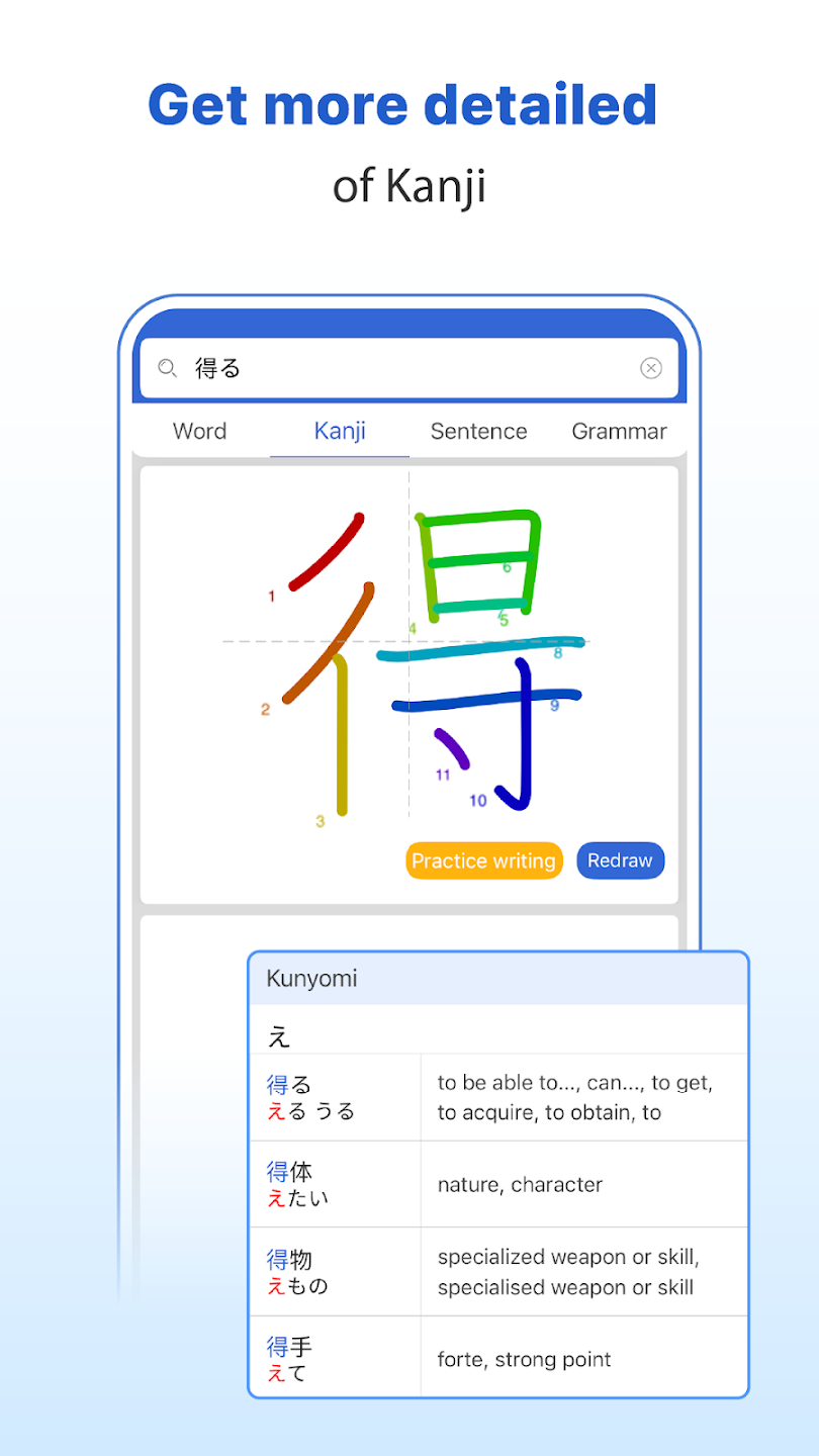 Are you struggling to remember a Kanji character? Or maybe you’re working with a tricky grammar rule. Don’t worry! Mazii will meet your needs. Users can quickly and easily look up words in various formats, including kanji, romaji, hiragana, and their native language. Mazii provides multiple tools for developing linguistic competence, including handwriting recognition, speech, camera, and manual input. Learning may take place anywhere worldwide thanks to the offline lookup and translation function!