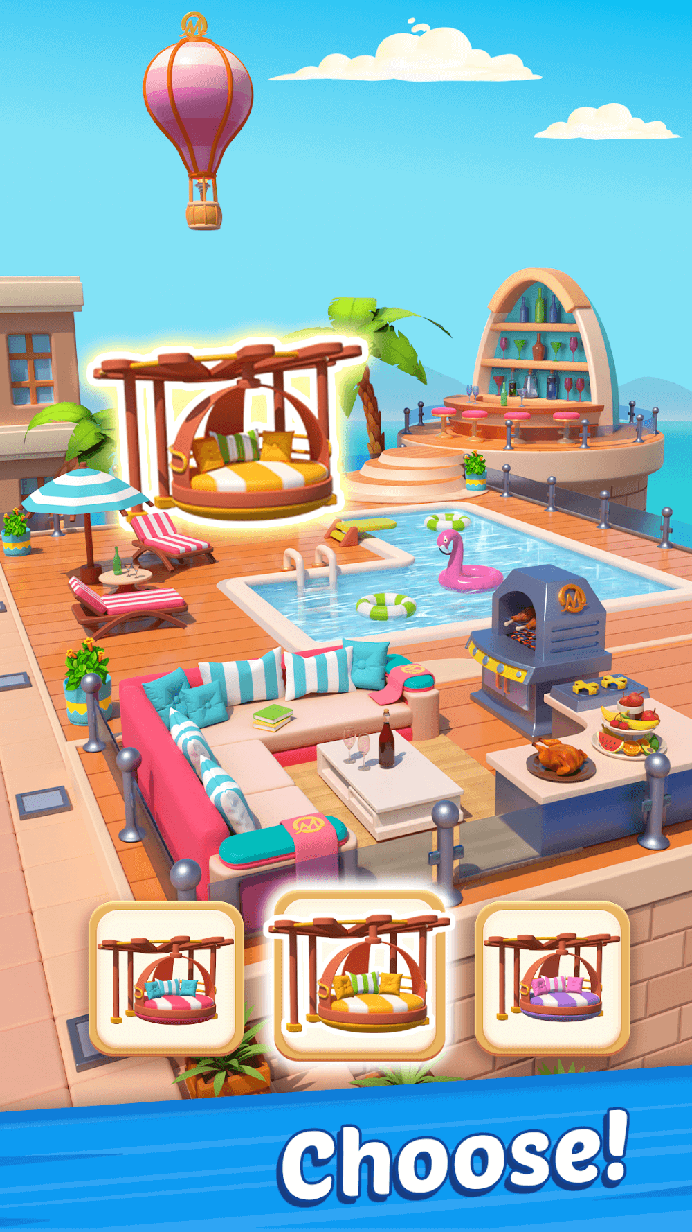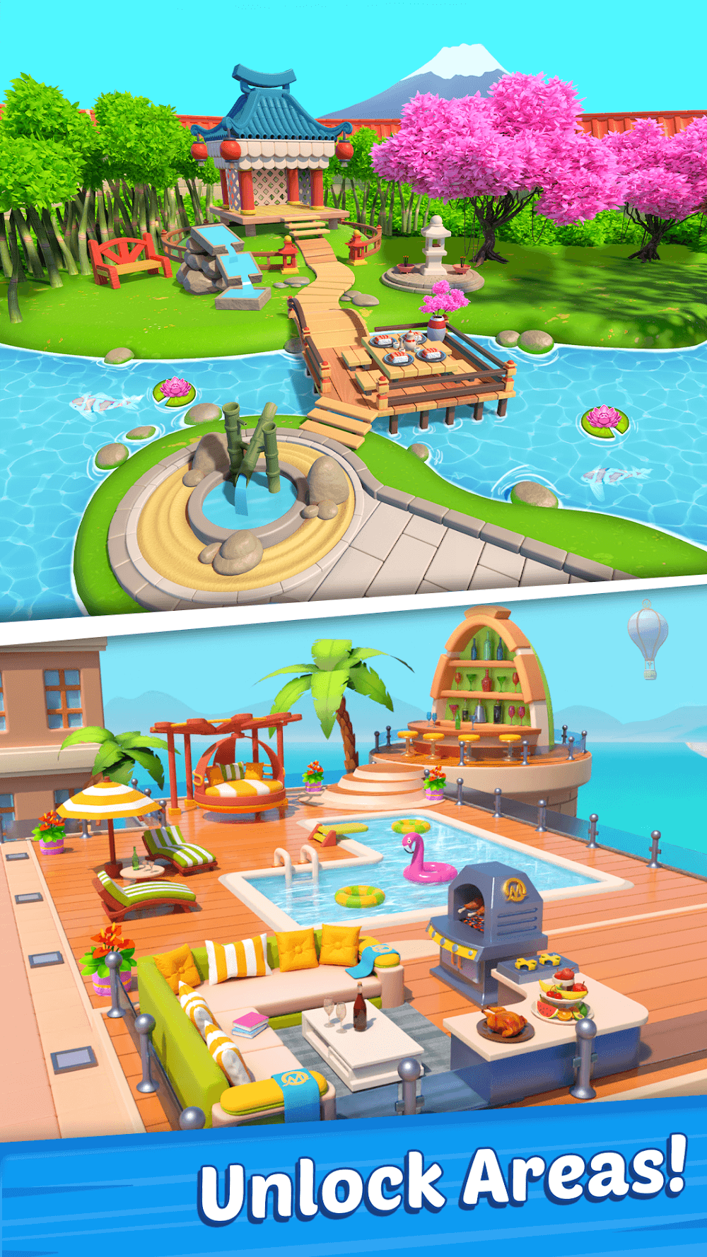 In Merge Fever: Merge & Design! Game, there are many levels with more fun and puzzle solving, and you play as the main character Emma who runs a restaurant. Emma is on her way to completing Cooking School, which was her Father’s last wish. Once the order gets ready, serve to particular customers with a single tap on the ordered food item. You should match the items in the puzzle board to prepare the ordered food, so if you are unaware of that item or how to prepare it, tap on the thing you want to see information about it. If you serve the orders to your restaurant customers, you can earn stars from them with your performance. In that way, high stars can earn more rewards like thunders and coins to build and develop the restaurant of your style. Suppose one of your restaurant plans is to develop Pool Side BBQ, so the first task is to fill the Pool, and perform many other tasks like Setup Swing Seat, Bring Sunbeds, Setup a bar, Install Planters, Place Sofa, etc.