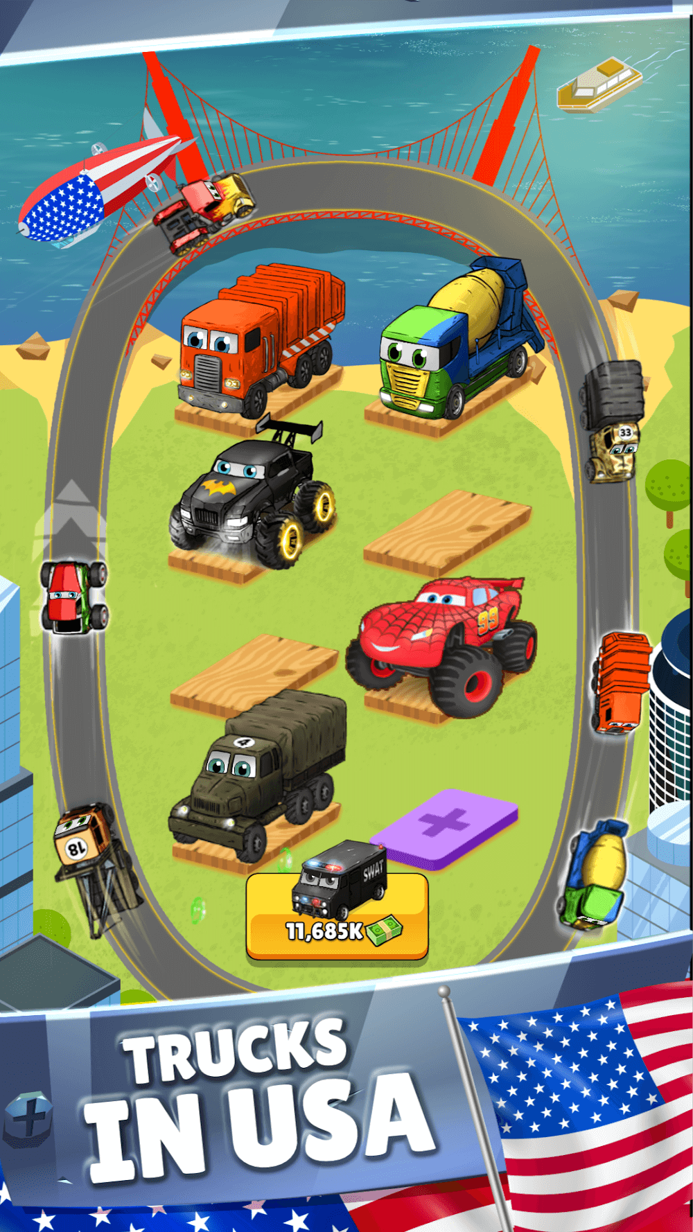Merge Truck differs from other racing games in that you can earn money by renting cars or racing. You can collect cash at two points on the road that the car will pass; the way it works is similar to a toll station. Besides, if not, these cars will also produce dollars for you; the money they earn will be calculated in seconds. You need to leave your vehicle in the parking lot, after a while, come back to harvest money. Due to the vast amount of money that parking generates, you can quickly become a billionaire.