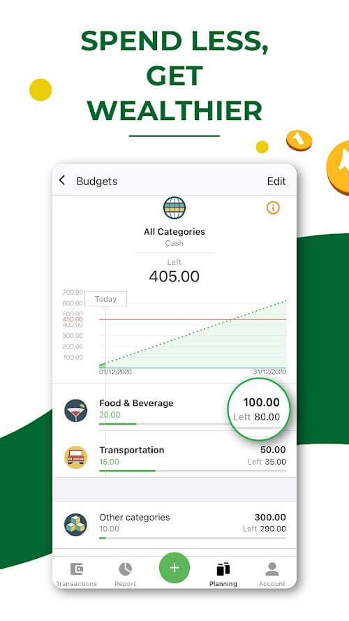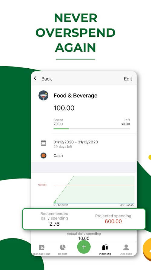 • Budget alerts: The app will send you notifications when you exceed or exceed your budget, which will be an important part of helping you stop or have a reasonable way of spending when you have exceeded your permitted level.