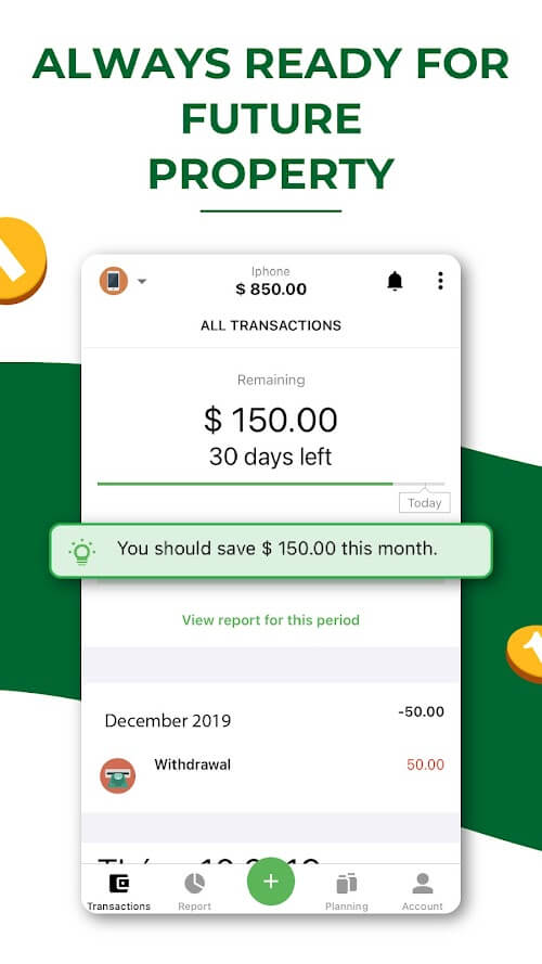 • Savings planning: The app allows you to pre-set your expenditure plan, you will start planning your expenditures and implement your expenses accordingly, this will be the most necessary and important factor for spending more reasonably.