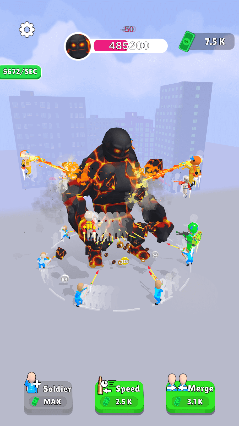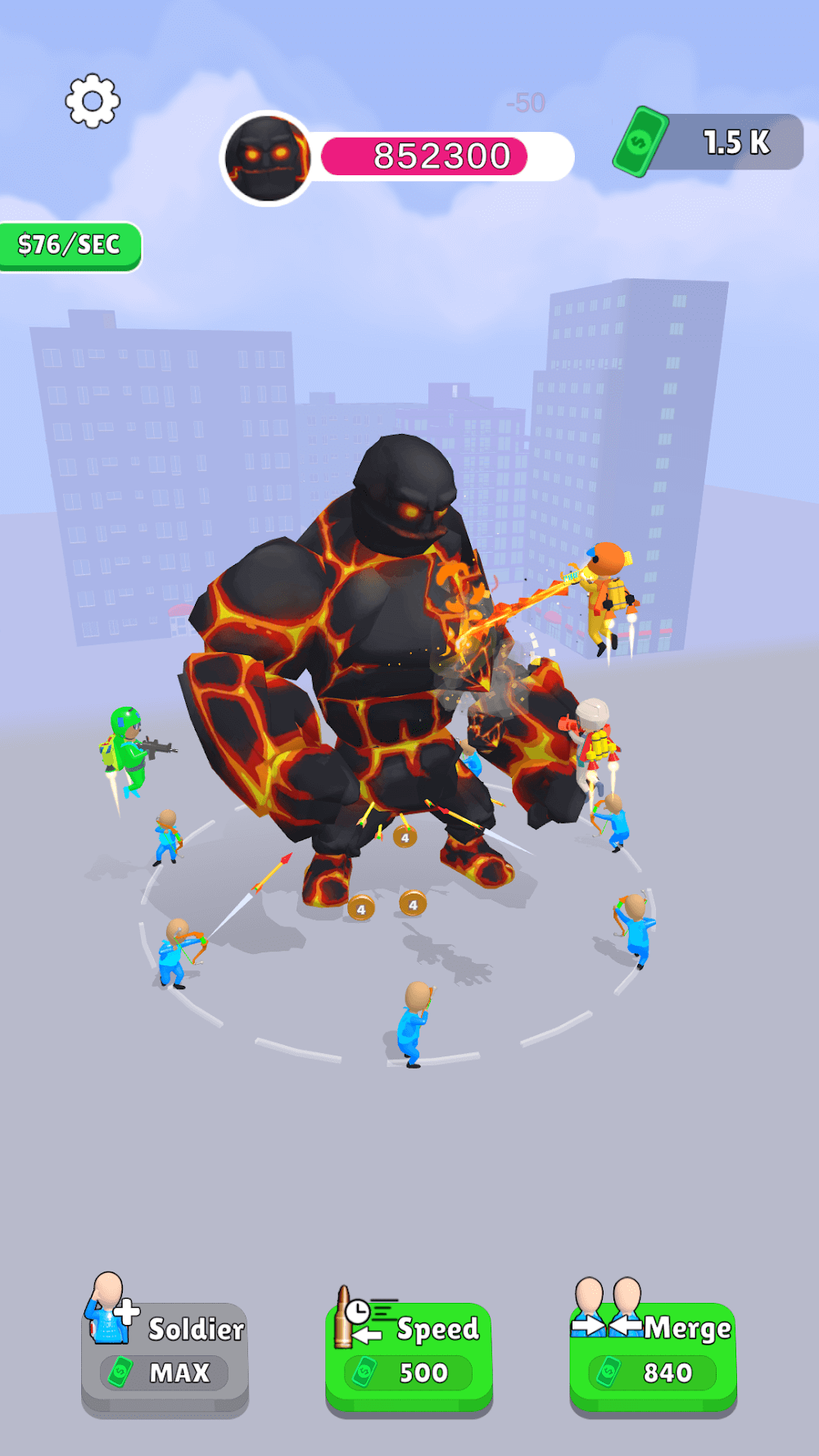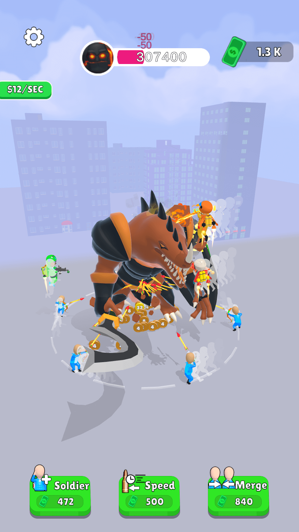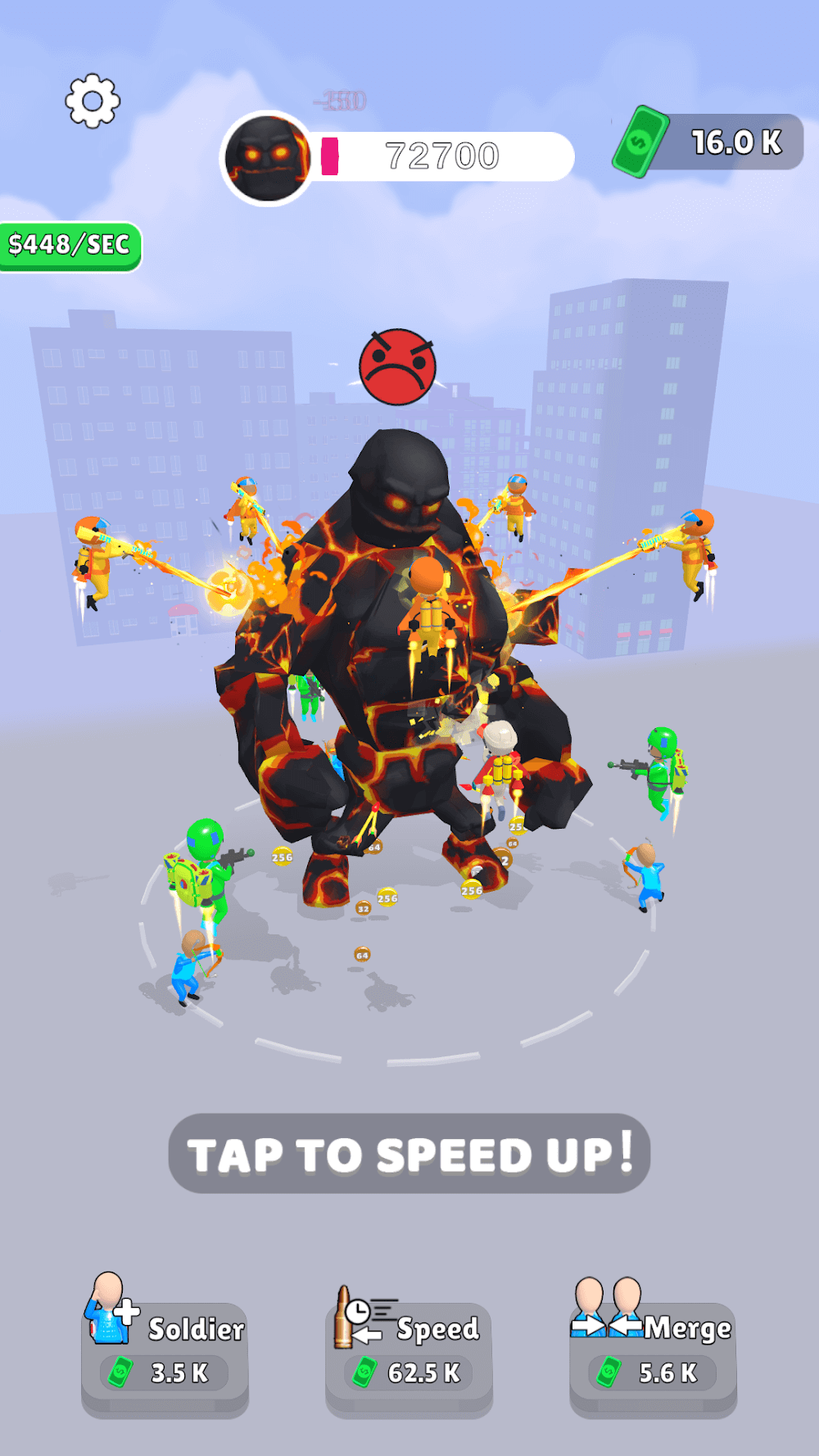 Simple gameplay only tap tap tap, tap makes to attack the monster. The demons will give considerable power in terms of some massive number, and all you need to do is shoot the beast. Shooting makes you earn some money; at the same time, the power of the giant will reduce based on your attacks. Use the cash to lease the soldiers, merge the soldiers, and increase the speed of the attacks. Lease the soldiers for the battle, which helps to defeat the enemy in less time. The lease will increase as to about to have more soldiers. To attain more power for the soldiers, use the cash you earned, merge the soldiers, and pull up among the monster. The attack of ordinary soldiers can reduce only the damage of 2 points, and the merging doubles the damage points to 4, 8, 16, 32, 64, 128, and so on. Next, the speed to increase the rate of your attacking speed upgrade your speed. The speed costs more than the other two, so use your money wisely. It displays the velocity of money you earn per second. The monsters produce shockwaves to stop you from attacking, but you don’t need to worry. The soldiers will dodge every attack of the beast.