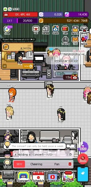 - Events: A packed schedule with tours, advertising contracts, fan events… keeps me busy but extremely excited. Each activity brings a source of income and helps me increase the group’s popularity.