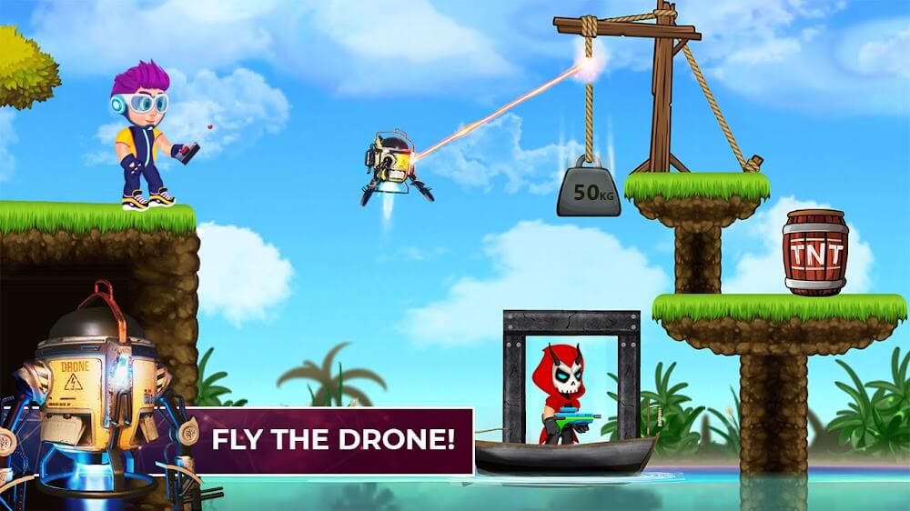 The famous gun, Mr. Shooter, will set the traps and engages in combat, and he also has access to various other weapons. The trajectory of the giant laser cannon will change when it collides with a metal object. Large conventional weapons will deal the damage needed to defeat the enemy. Drones can track enemies and drop traps or destroy an unsuspecting Earth. Not just one weapon, they can be combined in many ways by the player. You can pass the level by creating a remarkable sequence of events.