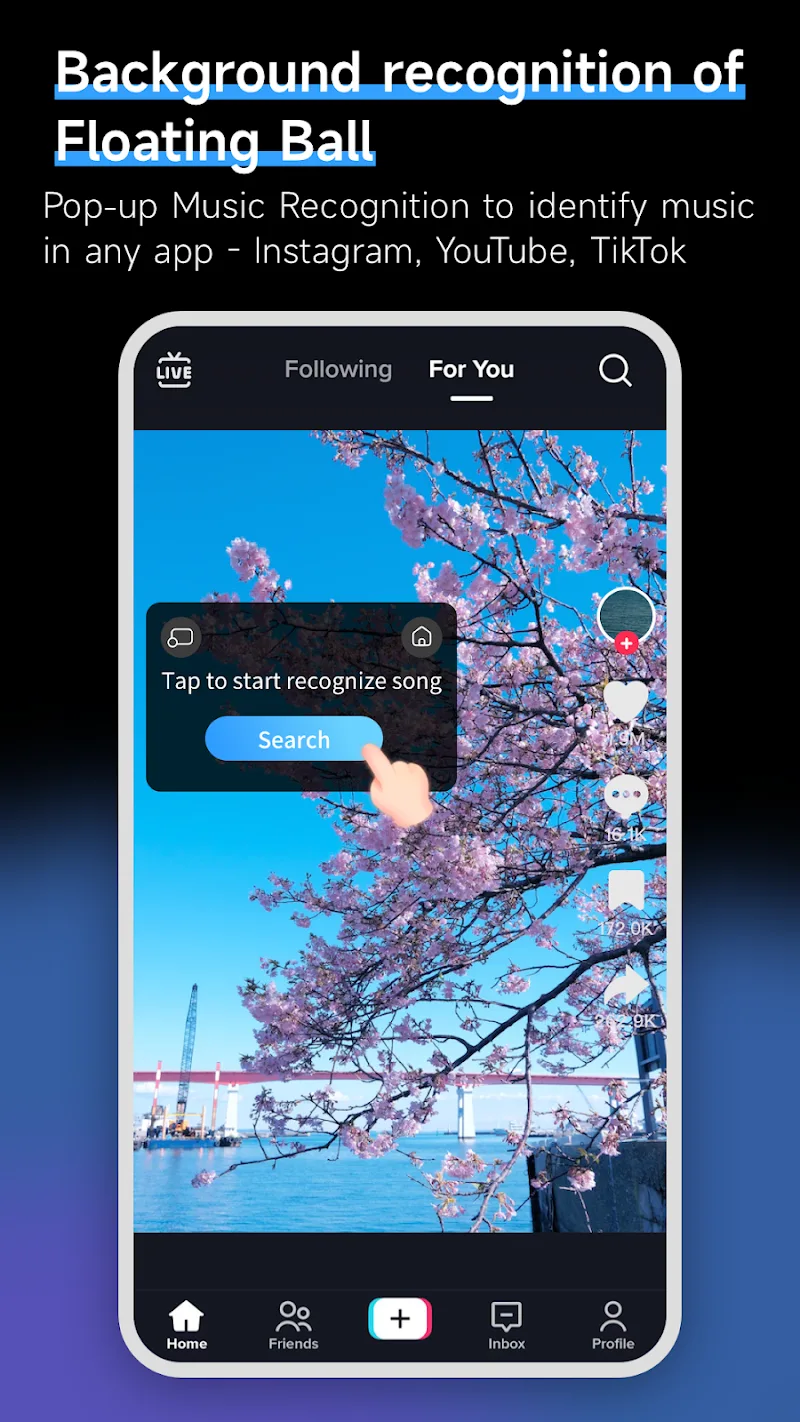 A handy feature is the ability to detect songs playing in external apps. Trigger the popup recognition from anywhere while listening to music. The floating widget will automatically grab a clip and return the result. Use it seamlessly while browsing Instagram or watching TikTok to identify songs. This makes Music Recognition a versatile second-screen companion.
