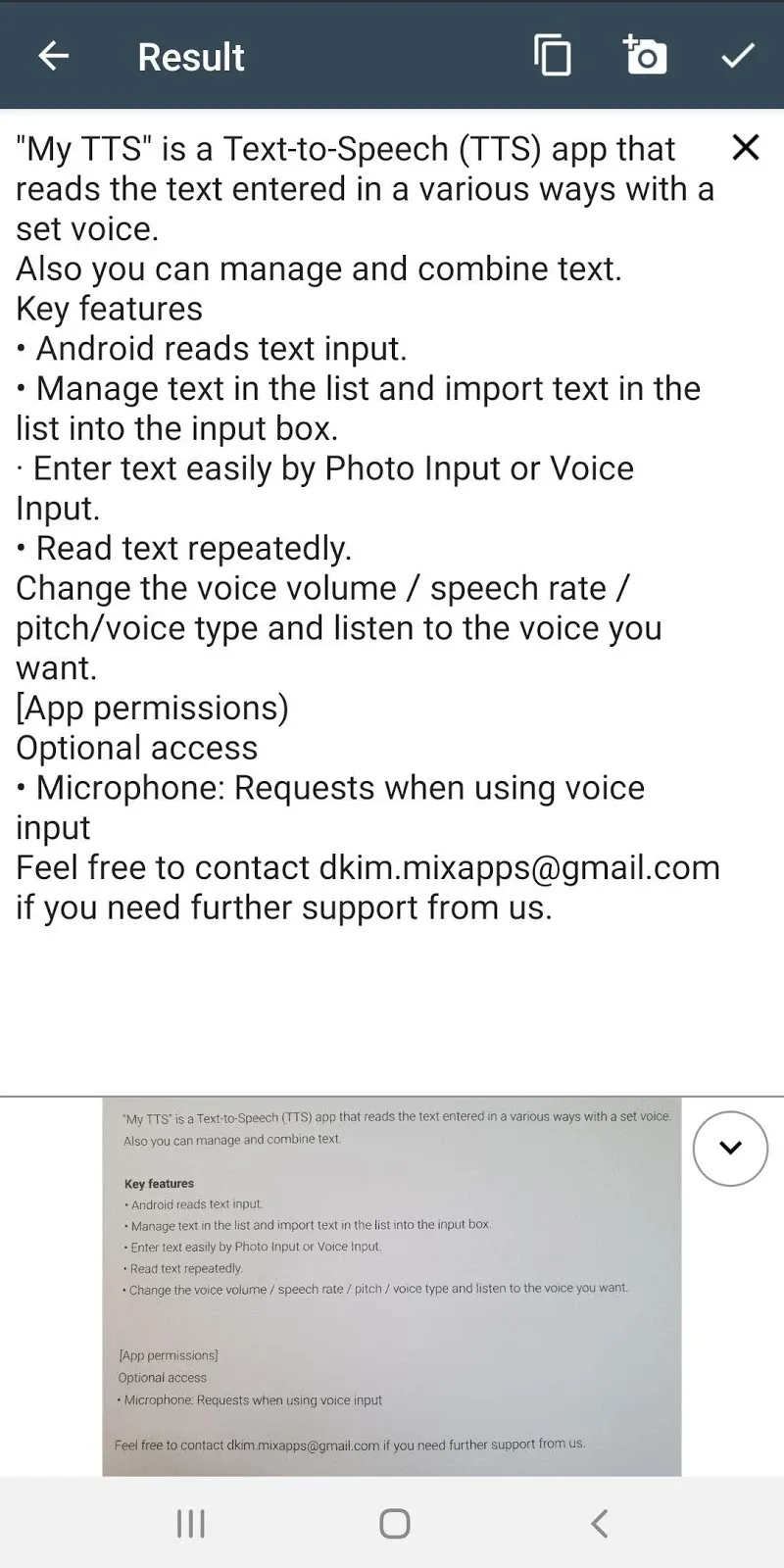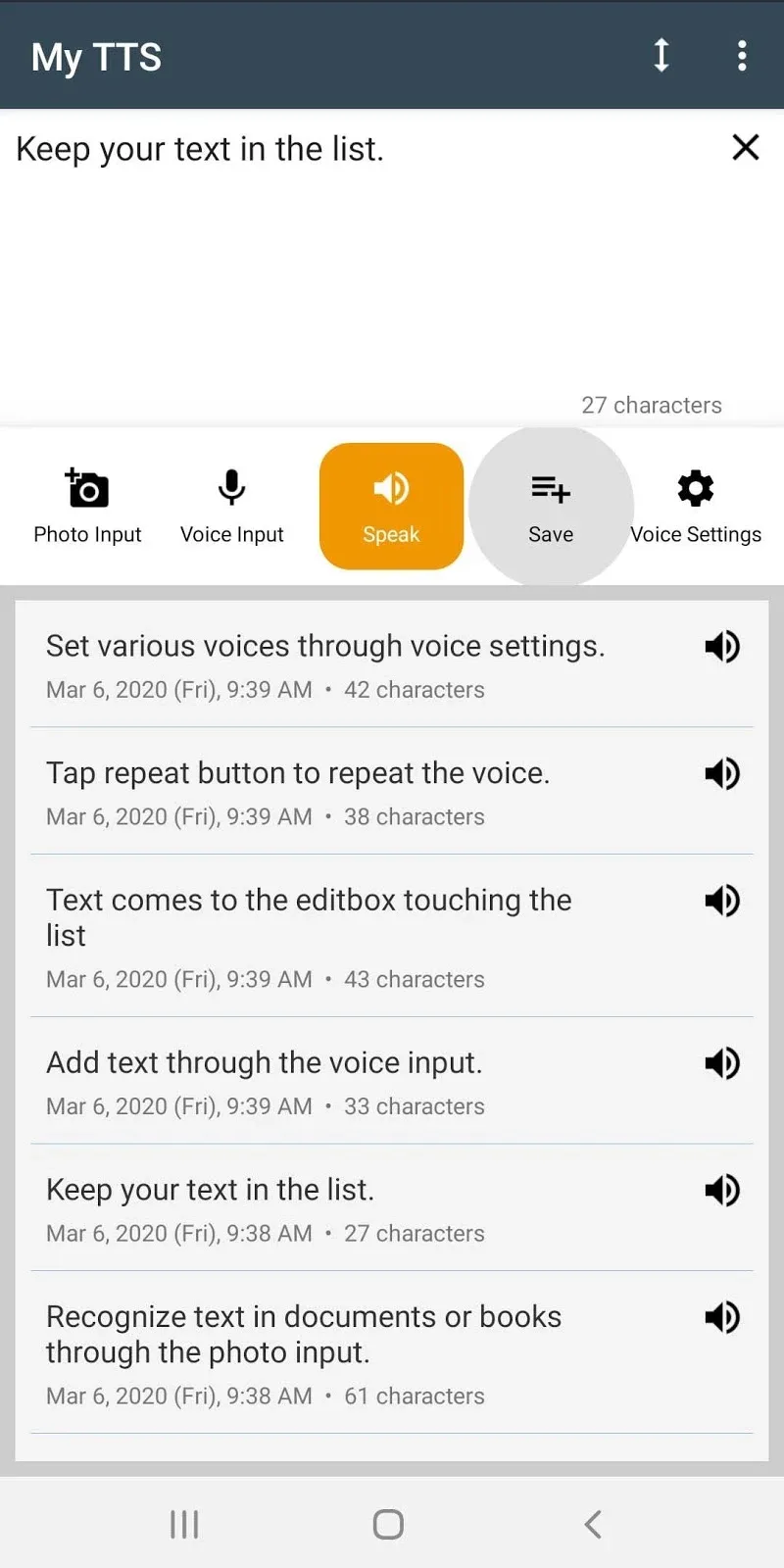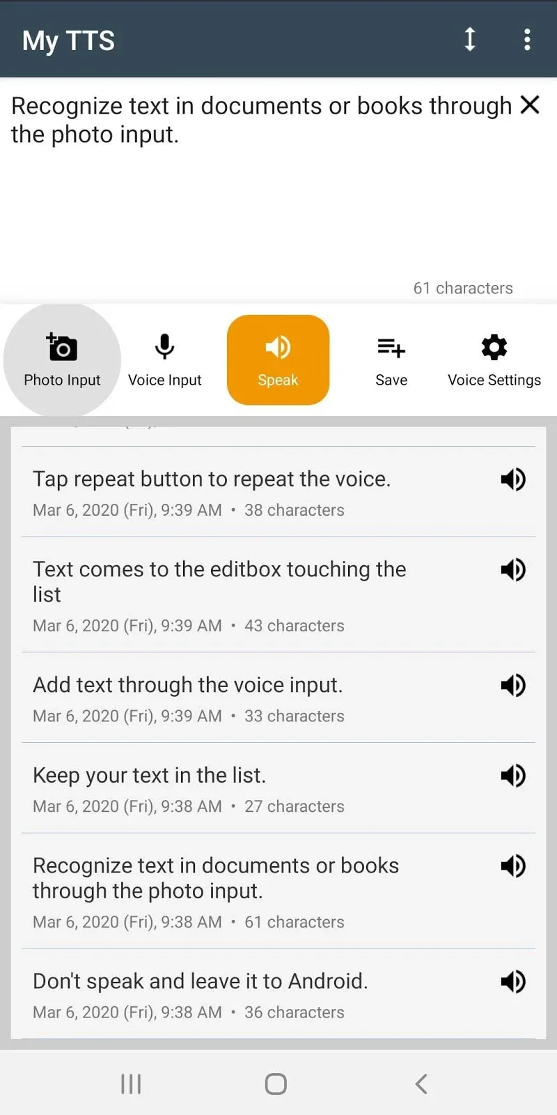 My TTS: Text-to-Speech is an application that can convert text to speech in just a few seconds. The application can convert any sound into text quickly and extremely easily. You will own perfect and accurate texts down to every detail. With this application, you do not need to type manually anymore, but still have the perfect results. Come and experience this convenience.