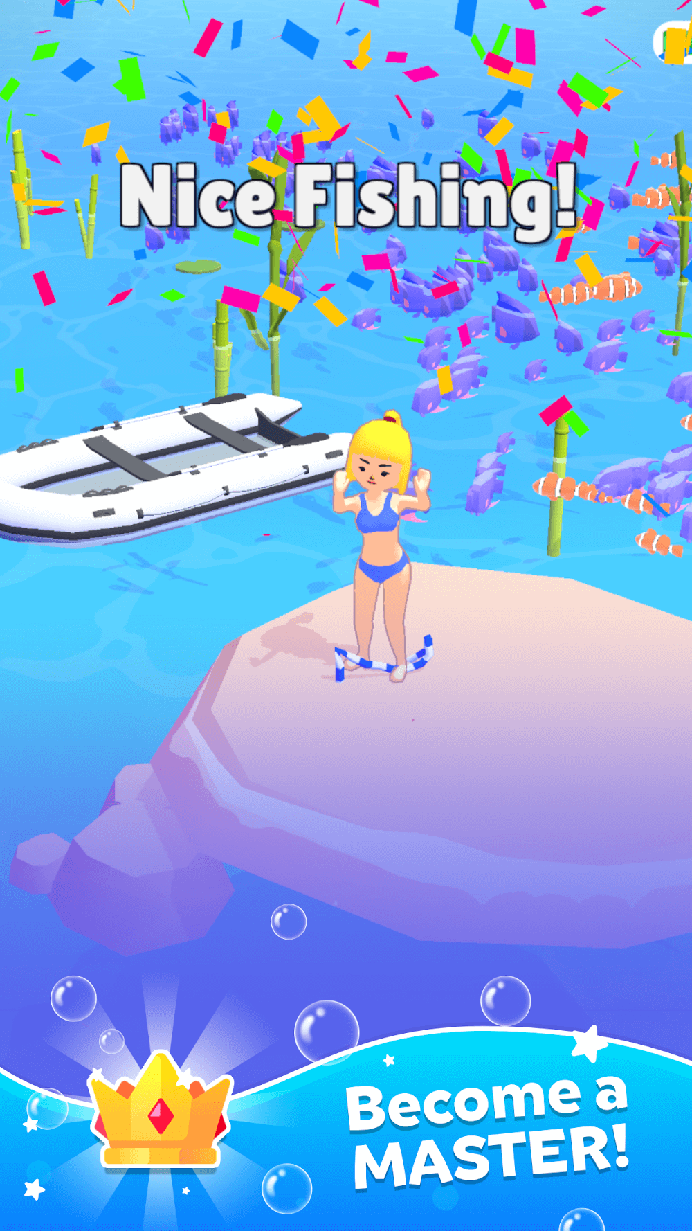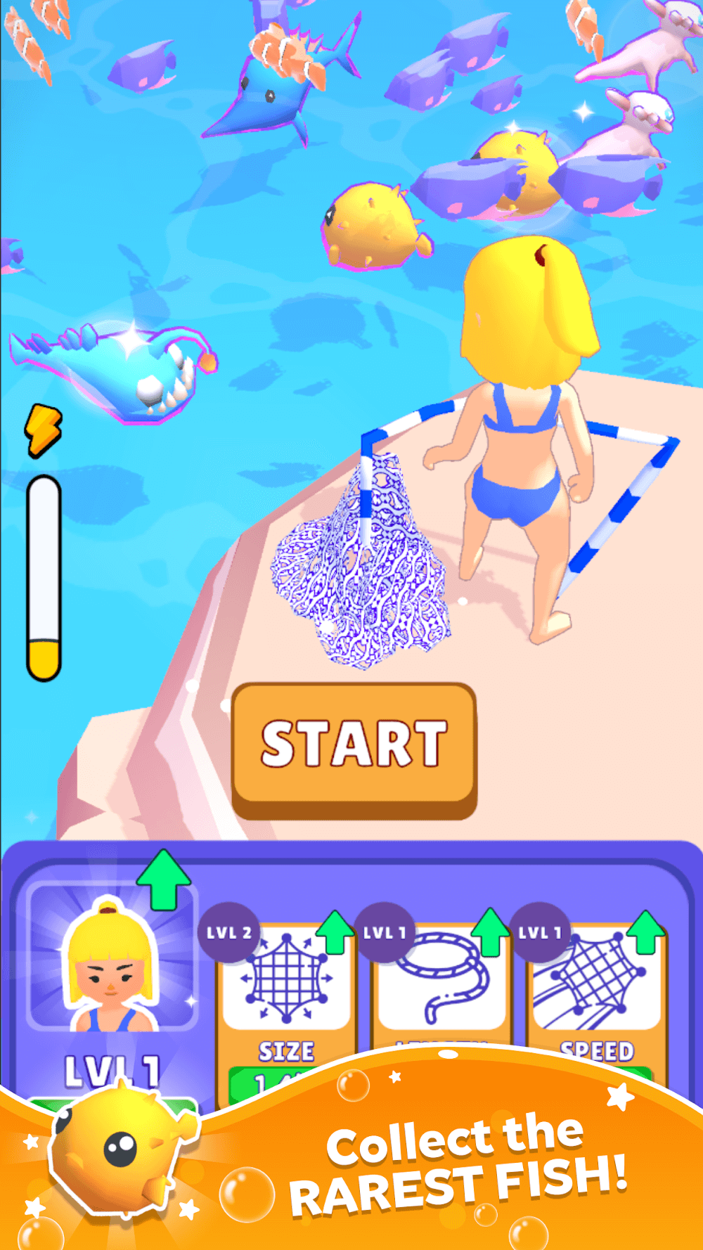Net Fishing! will give you endless satisfaction and a bustling feeling from the ever-lasting summer, where you dive into numerous water-related activities. Thus, the game focuses on fishing with nets, where you find different approaches to building a thriving aquarium or relaxing heaven by catching fish in massive batches through net fishing.