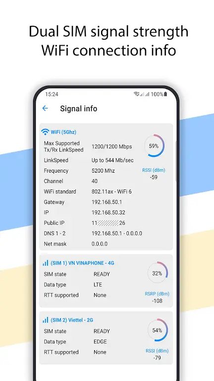 Connecting to Wifi allows users to access more information. However, the Wifi signal strength will not be stable. Net Signal Pro:WiFi & 5G Meter helps users check and record signal strengths. Information panels are shared directly on the screen for easy monitoring.