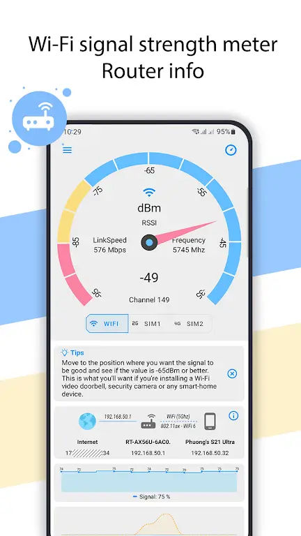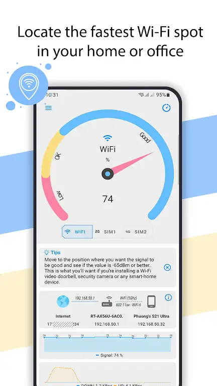 • Optimal Placement: Wifi will have strong and weak strengths depending on the user’s location. The application will help users determine the appropriate location to connect to wifi. In addition, the mobile device signal is also measured by the application. The strength of the signal will help users connect faster with everyone.
