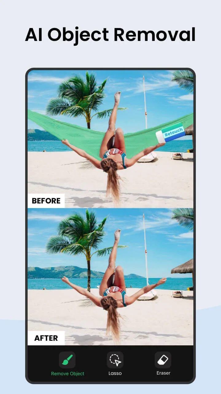 While the automatic removal works wonders, Pic Retouch also equips you with precise editing tools. Adjustable brush sizes allow you to paint over unwanted areas freely. The Lasso tool lets you outline objects for clean removal. An Eraser feature then optimizes your selections to erase objects flawlessly. Pinch-to-zoom gives you surgical precision, while Undo/Redo functions allow you to correct mistakes. The Before/After feature lets you preview changes, so you can check your work.
