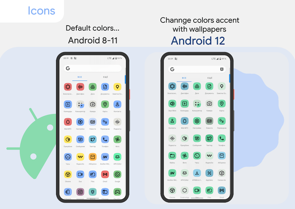 • Adaptive Shapes: Pix Material You Icons brings me a completely new icon collection, designed in the Material You style of Android 12. What impresses me most is the “Adaptive Shapes” feature – the ability to change reshape and have a linear colored background for the icons.