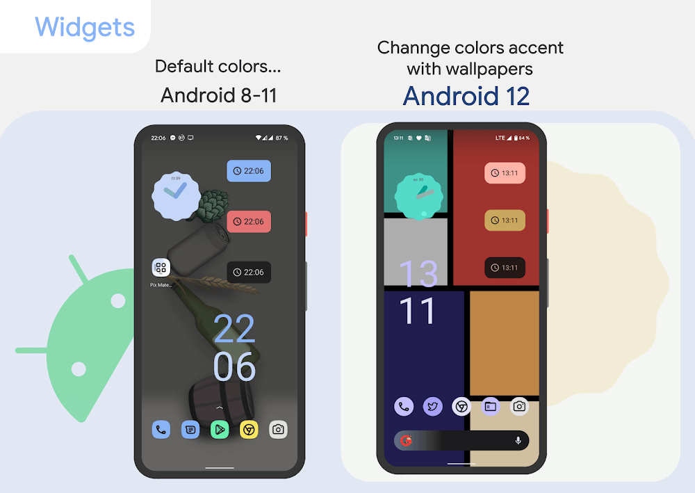 • Material Widgets: Includes a collection of clock widgets designed in the Material You style. Each widget has a vibrant color and soft lines creating a new and vibrant look for your home screen.