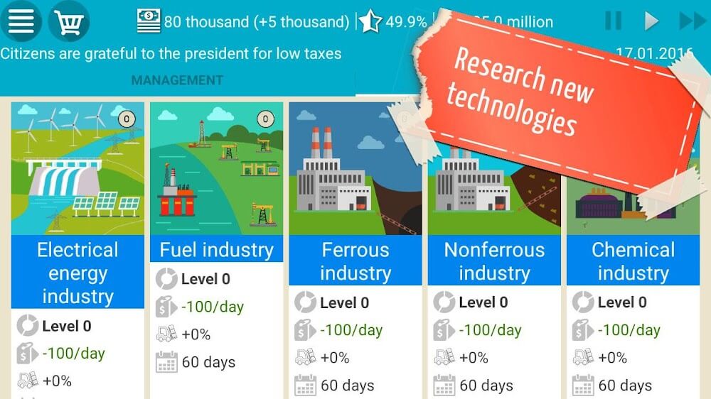 Using President Simulator, you have total control over administering a country. This game simulates the challenges of becoming a nation’s leader. These challenges include building factories, managing resources, and dealing with natural disasters and wars. With over 50 different plants and corporations and over 20 different ministries and agencies, you can devise your administration strategy and approach for the country.