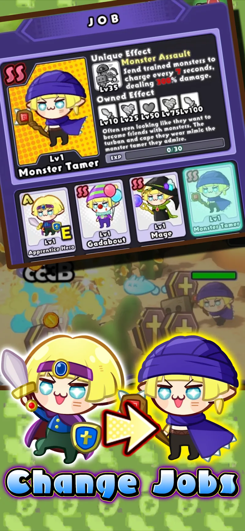 Strengthen your hero by simply tapping buttons to raise attributes like HP, attack, defense, speed, critical hit chance, and more. Get stronger over time completely passively! Recruit and level up various monsters like slimes, goblins, golems, and more to have them fight by your side. Build your ideal battle party! Change jobs to mage, playboy, monster tamer, and more to learn new skills that devastate foes. Mix and match jobs for the best builds!