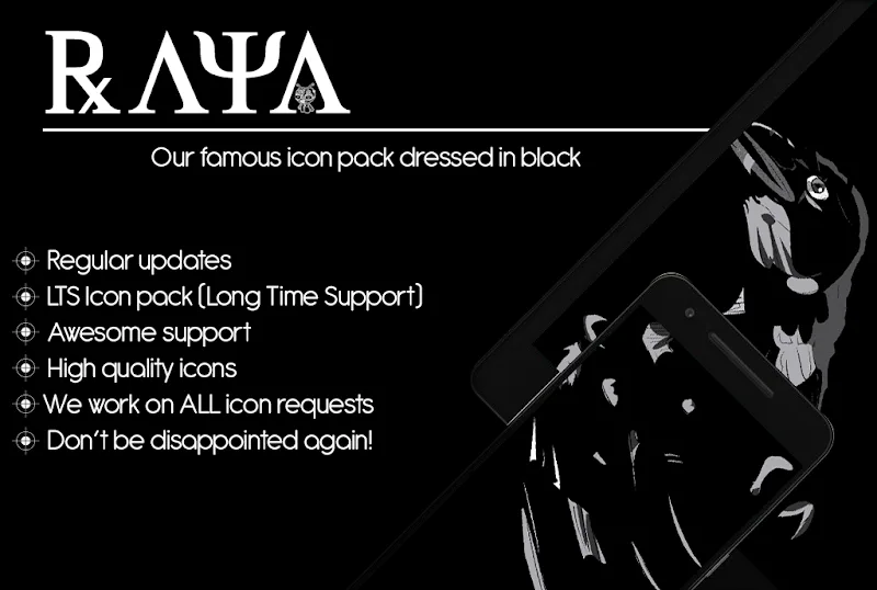 - Popular Pack Variant: The app creates many different versions of icon packs. But the most popular is still the unique black version of the Raya Icon Pack. The products that appear in this pack all represent the spirit and main style that the app is aiming for.