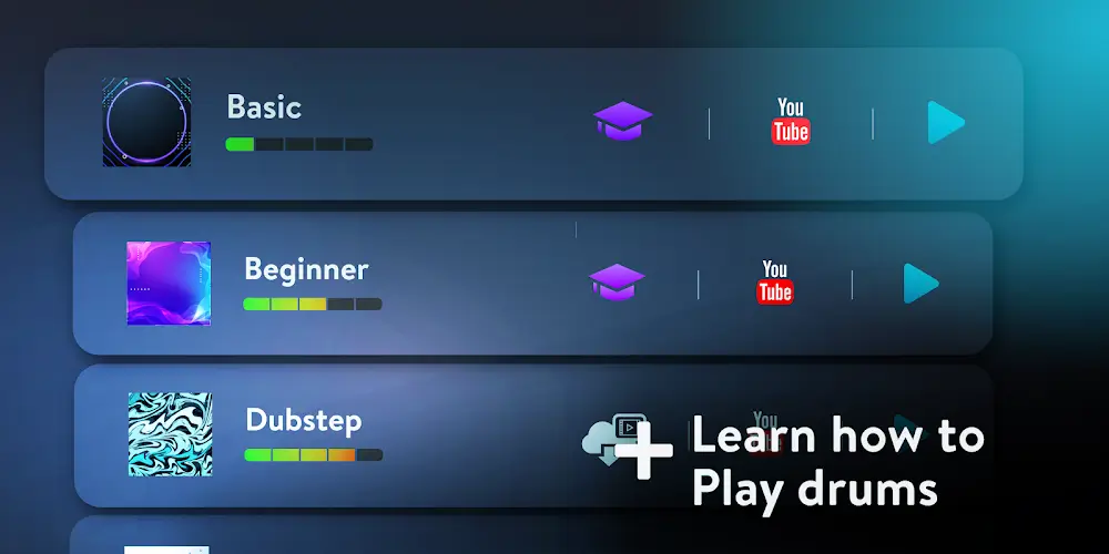The application offers interactive video lessons to help users learn how to play drums. Besides, you can get acquainted with the program in elementary form and then upgrade to advanced learning. If you are slow to learn or the initial basic lessons are a bit difficult, you can choose the slow-player format. Adjust the appropriate speed to help you absorb solid knowledge and apply it quickly.