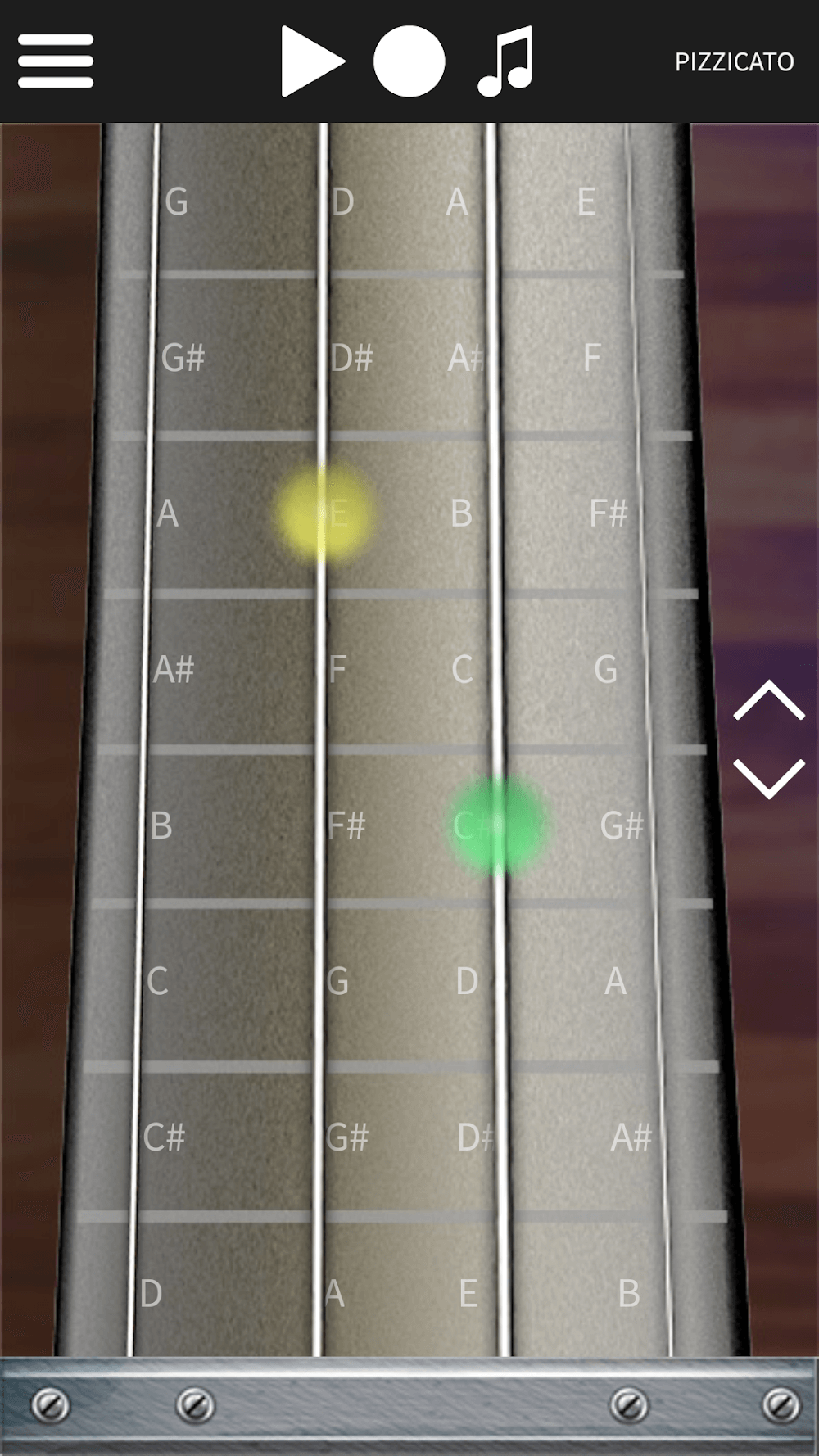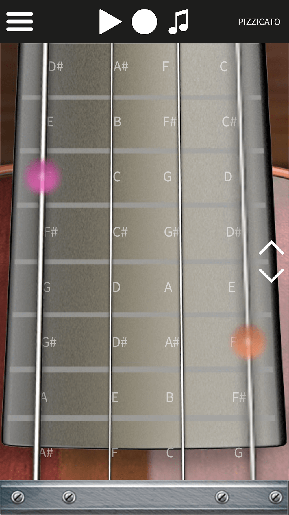 THE SCROLLABLE VIRTUAL VIOLIN IN THIS APP FEATURES 64 NOTES AND AN OVERLAY TECHNIQUE THAT CAN BE HELPFUL FOR NOVICES