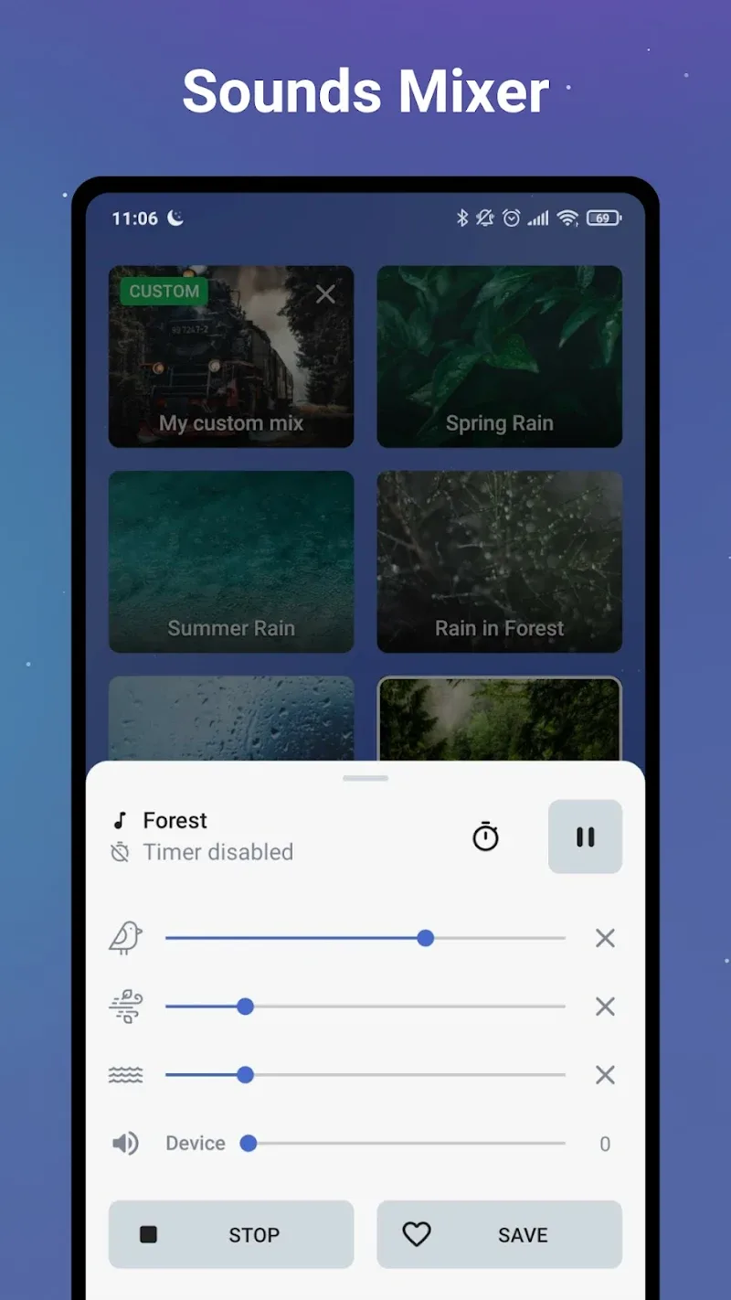 • Customizable Sound Blends: The application can combine personalized unwinding sounds. In this manner, each individual can make numerous choices based on their wishes and current circumstance to unwind rapidly.