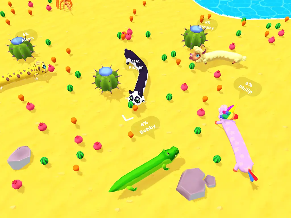 - Grow, Progress, Win: Before causing difficulties for opponents, players need to change their appearance. Specifically, they need to become bigger by eating items scattered in the environment.