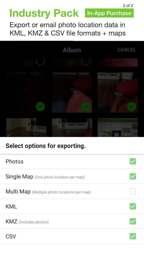 Send an attachment containing multiple photos and related metadata in either KML, KMZ, or CSV format is one of the main capabilities of this app. You should include location maps in any images emailed or exported and choose the format(s) that are most convenient for you to save your images, maps, and data. There are several options available, and photos can be exported or emailed individually or as part of a compressed archive file.