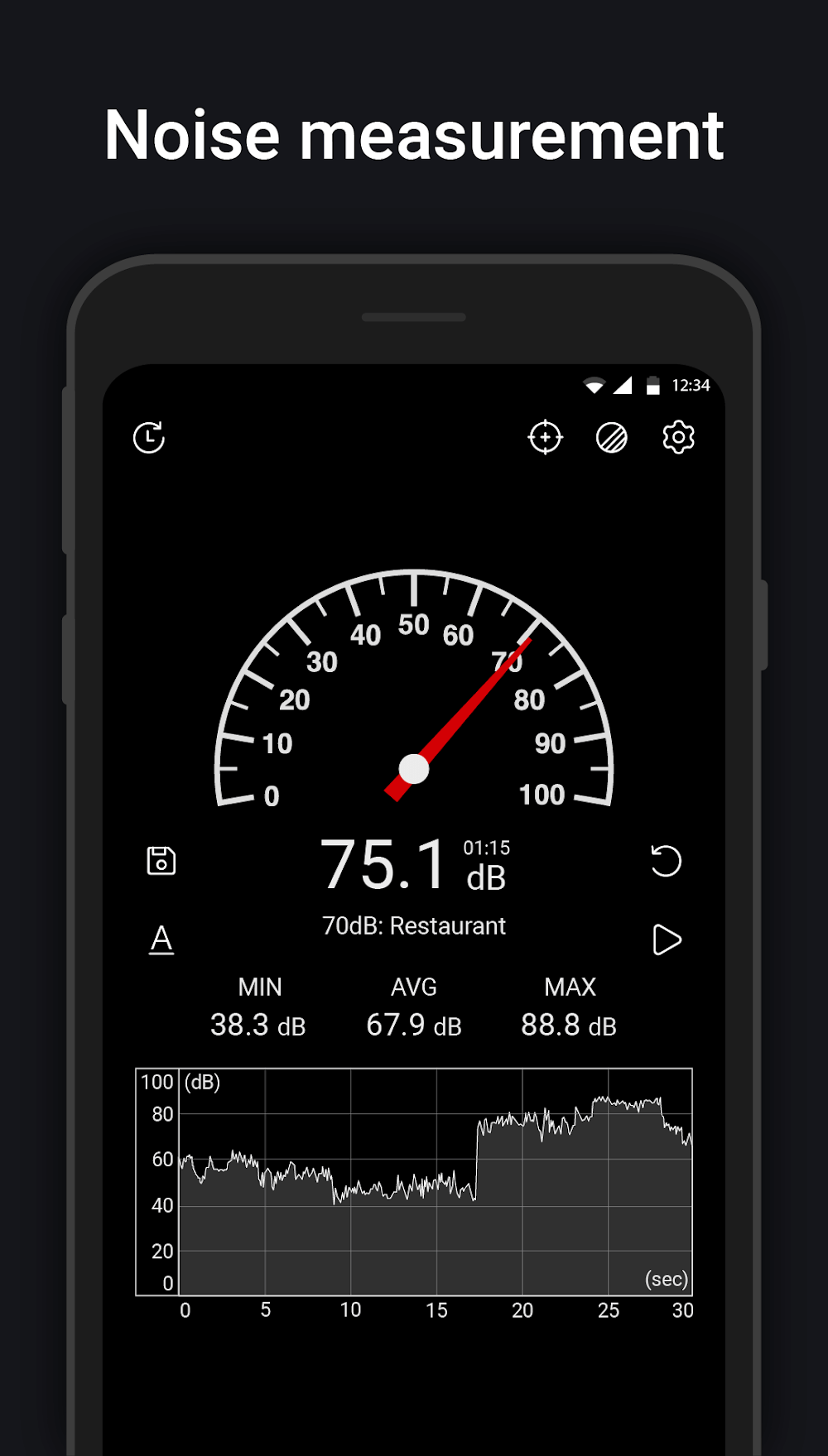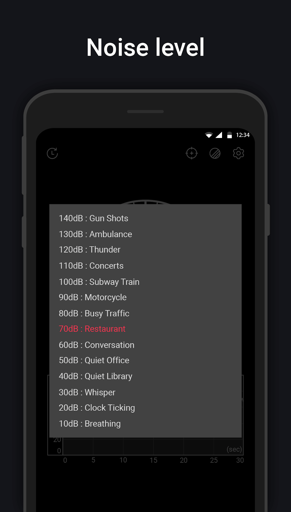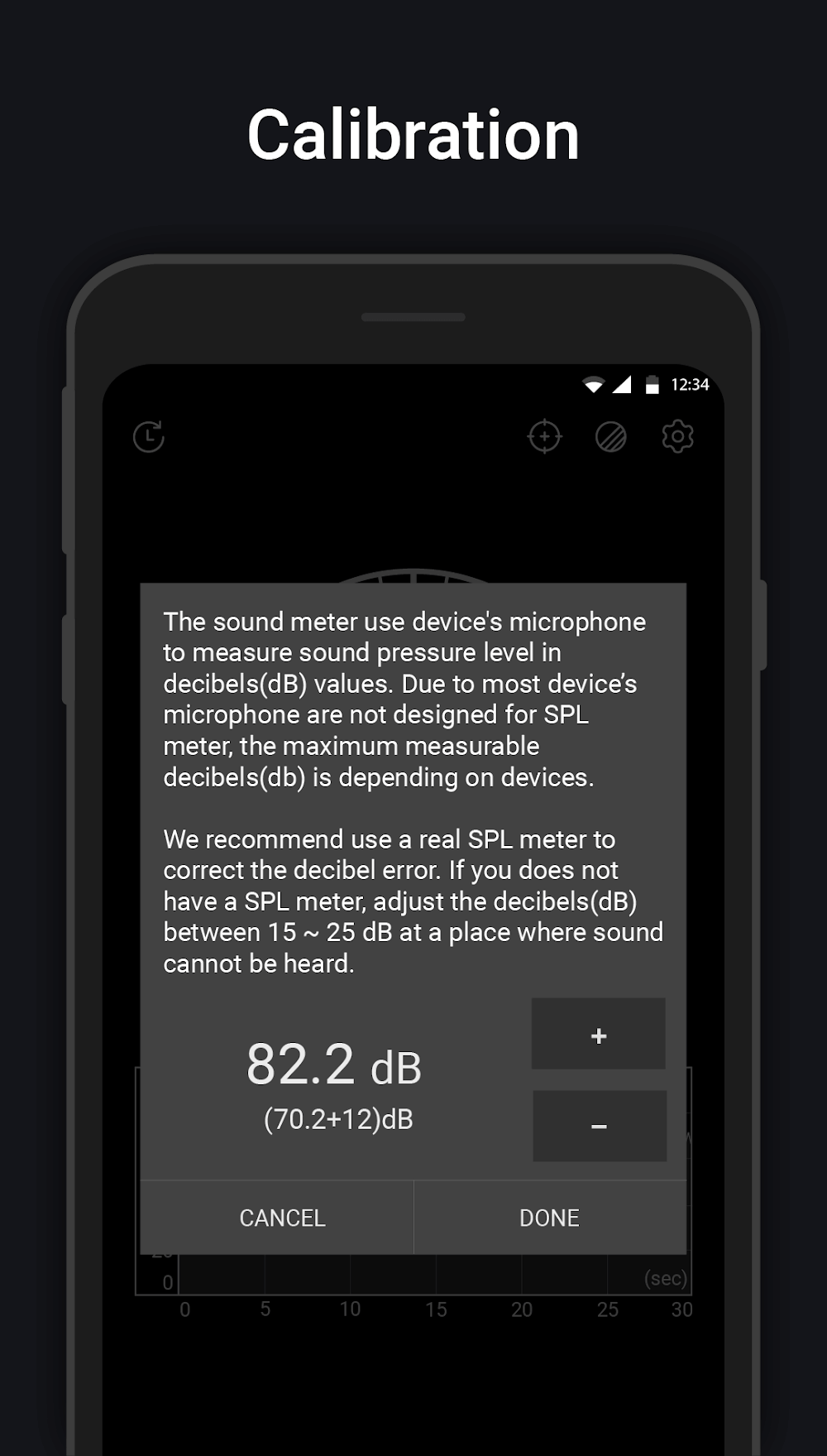 The application uses the mobile device’s microphone to capture sound, then conducts analysis and measures the sound intensity in your surroundings, especially the space closest to the microphone. The unit of noise intensity is Decibel (dB).