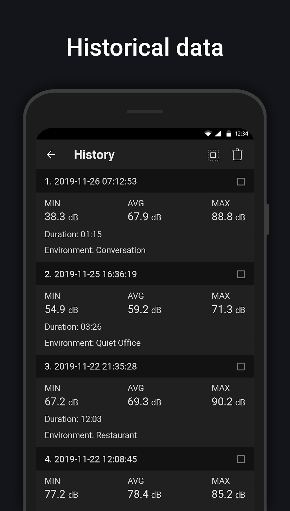Sound Meter records a history of times you measure sound, with date and time as well as specific noise index information, giving you the most objective comparison between environments.