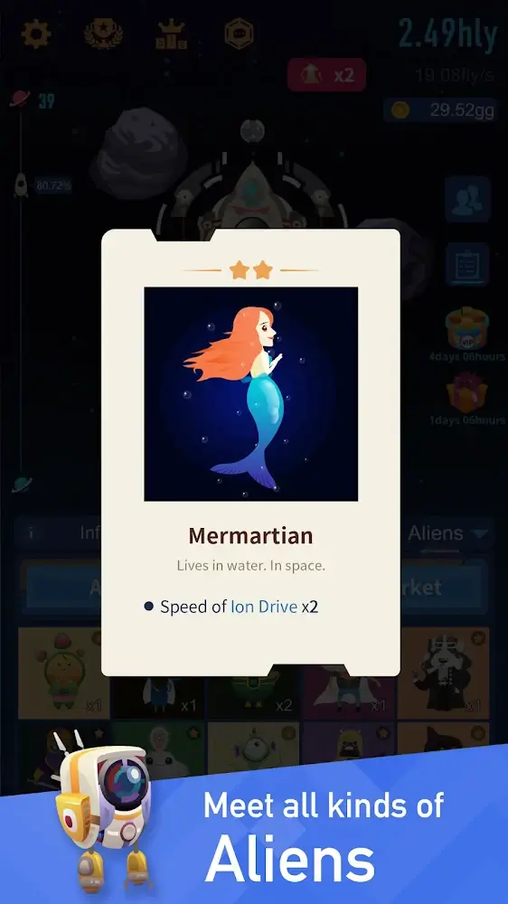 Space Colonizers Idle Clicker Mod Apk is the perfect combination of simulation & strategy genre in the vast universe. With easy gameplay, you need to touch the screen to move and accelerate. When you come to a new planet, more and more people are immigrating and trying to save the people of Earth. Use the Black Hole to get to the other planets faster and know the aliens.