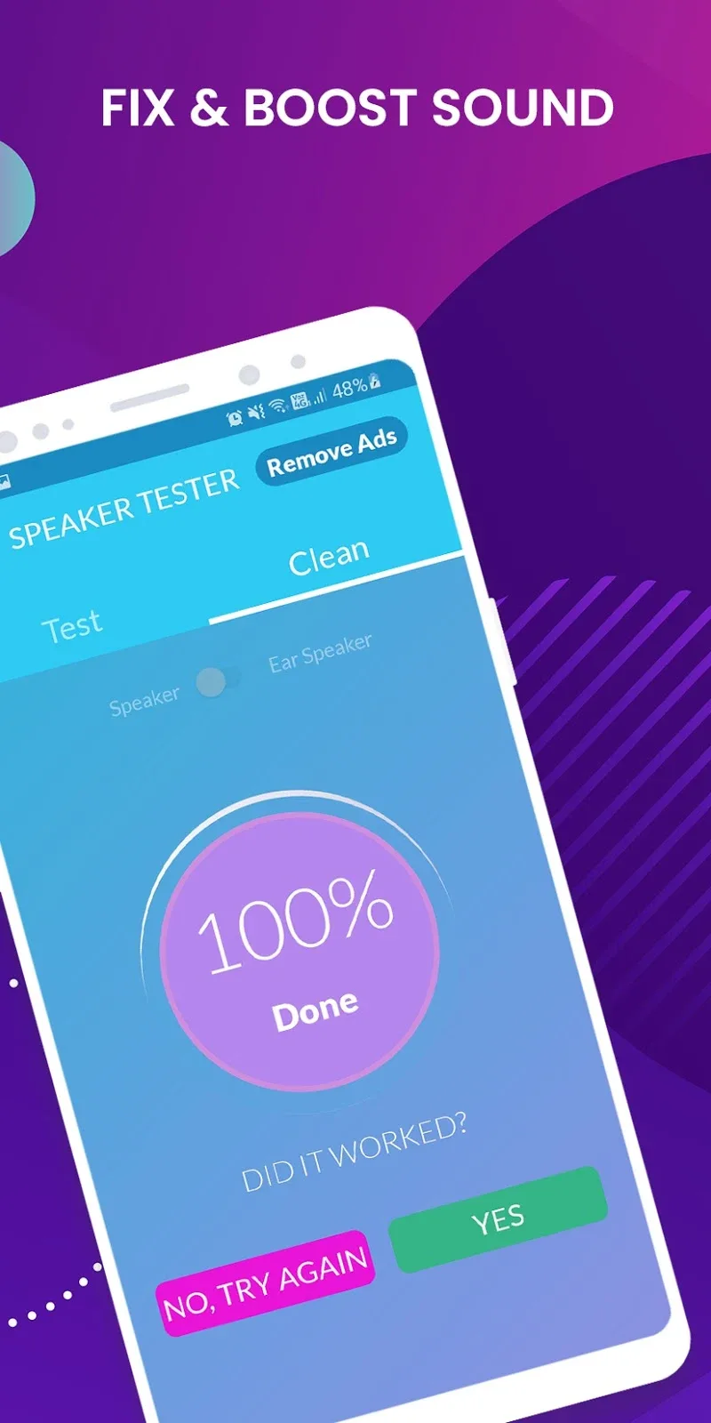 Beyond testing, Speaker Tester & Cleaner strives to actively improve speaker performance. The app’s speaker booster capability clears out audio memory to optimize sound quality. Volume can also be boosted to enhance loudness based on the user’s desired levels. These speaker enhancement features help underperforming phone or Bluetooth speakers achieve fuller, louder sound comparable to higher fidelity models.
