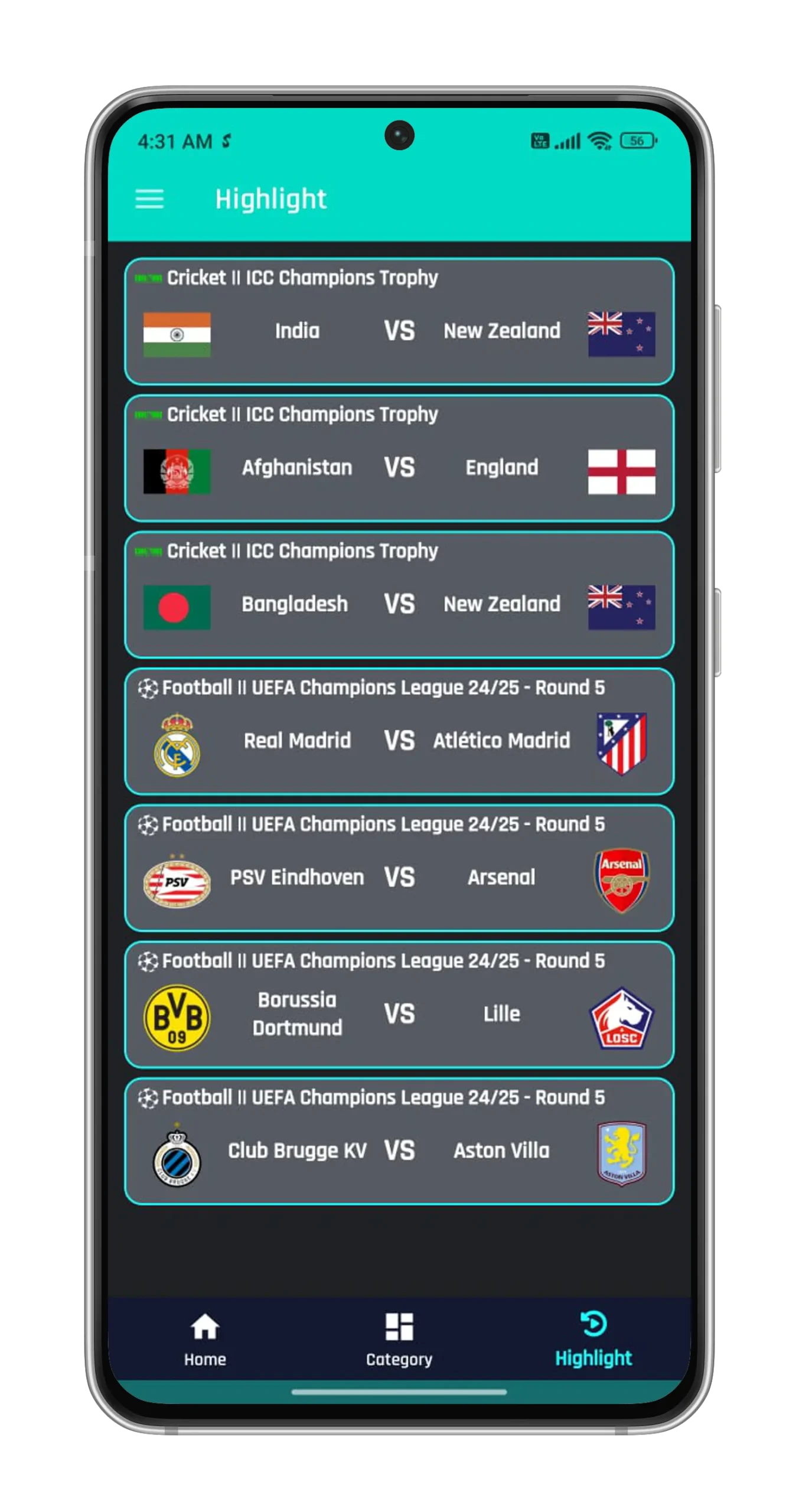 - Watch all sports live: You can watch football, basketball, UFC, cricket and major tournaments such as EPL, IPL, World Cup T20, NBA, UEFA, NFL, … completely free right on your Android device with clear and smooth images.