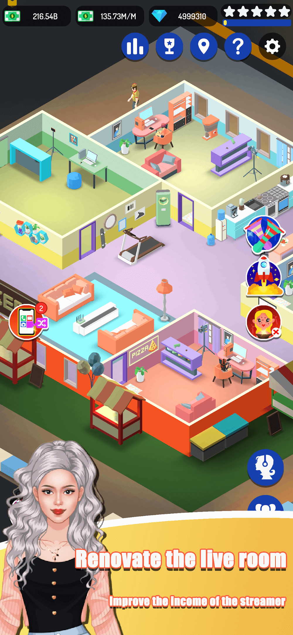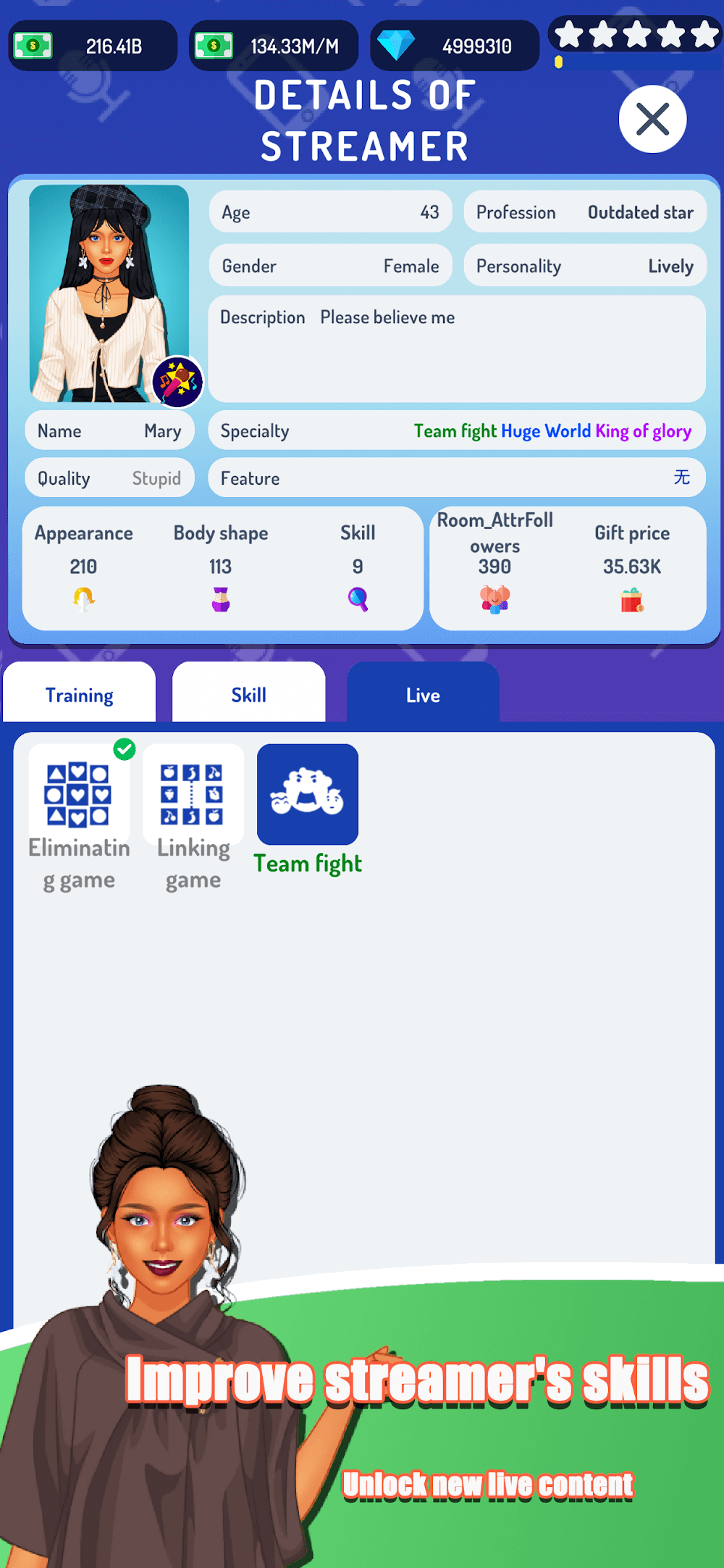 Thanks to the idle system, you can make your streamer more famous through various means, and as a female streamer, you will have more access and easier methods to attract more fans. Besides that, you can upgrade various minor components for the female streamer and improve her attractiveness to draw in more viewers. Every element matters, and it’s up to you to make the streamer more radiant or excellent in content-making. Plus, you must help the streamer compete with others, climb the rank to earn more revenue, and become the best streamer ever.