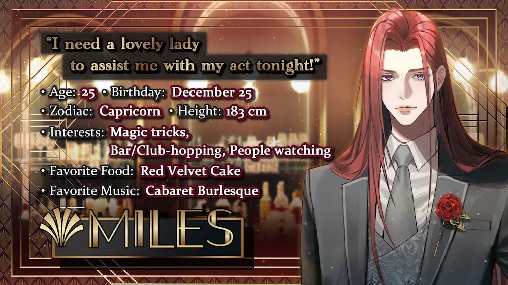 Miles, who spends his days as an investment banker and his nights as a vampire lothario, likes to come to the club so that he may break away from the monotony of his workday. The fact that he does not have a family and does not have a life partner, even though he is a vampire of high prestige, has made him a controversial character. It would appear that he has an eternal passion for the evening. It’s up to you to find your way into his heart and make him bow before you with your progression.