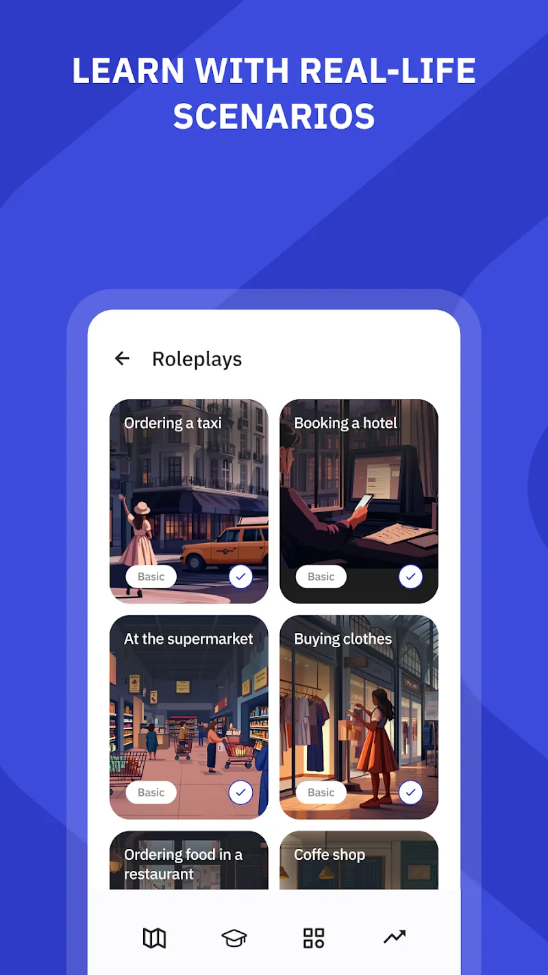 - Role-Playing Mode: Practice in real-life scenarios such as traveling, job interviews, meeting friends, or dating.